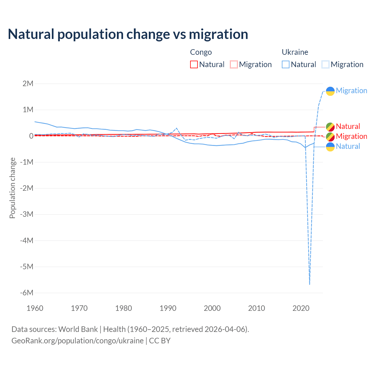Over the last 10 years, 94% of the population change in the Congo is from natural causes (a gain of 1,434,056 people) and 6.04% is from migration (a loss of 92,251 people). In Ukraine 28.2% is from natural causes (a loss of 2,435,153 people) and 71.8% is from migration (a loss of 6,198,995 people).