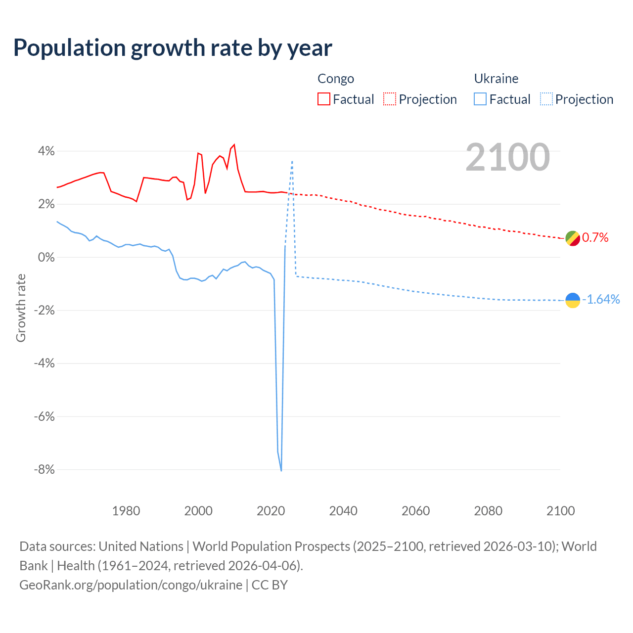 - For the last 10 years, the Congo has had an average growth rate of +2.44% per year vs -1.74% in Ukraine.