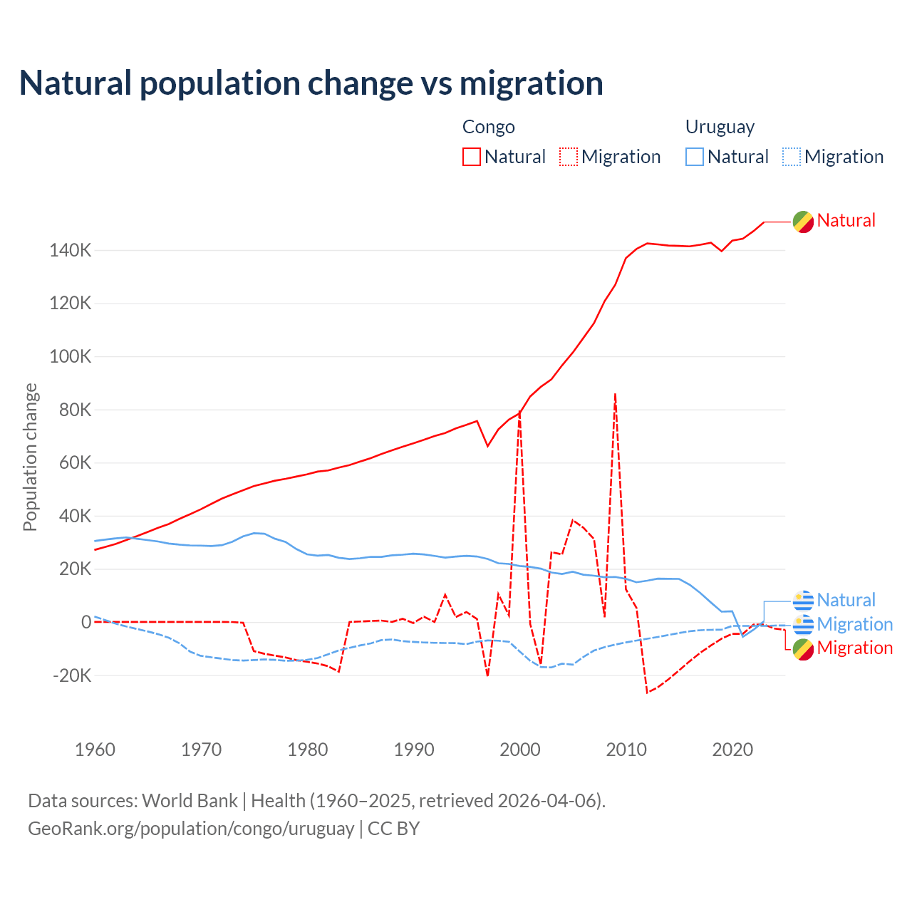 Over the last 10 years, 94% of the population change in the Congo is from natural causes (a gain of 1,434,056 people) and 6.04% is from migration (a loss of 92,251 people). In Uruguay 70% is from natural causes (a gain of 64,303 people) and 30% is from migration (a loss of 27,501 people).