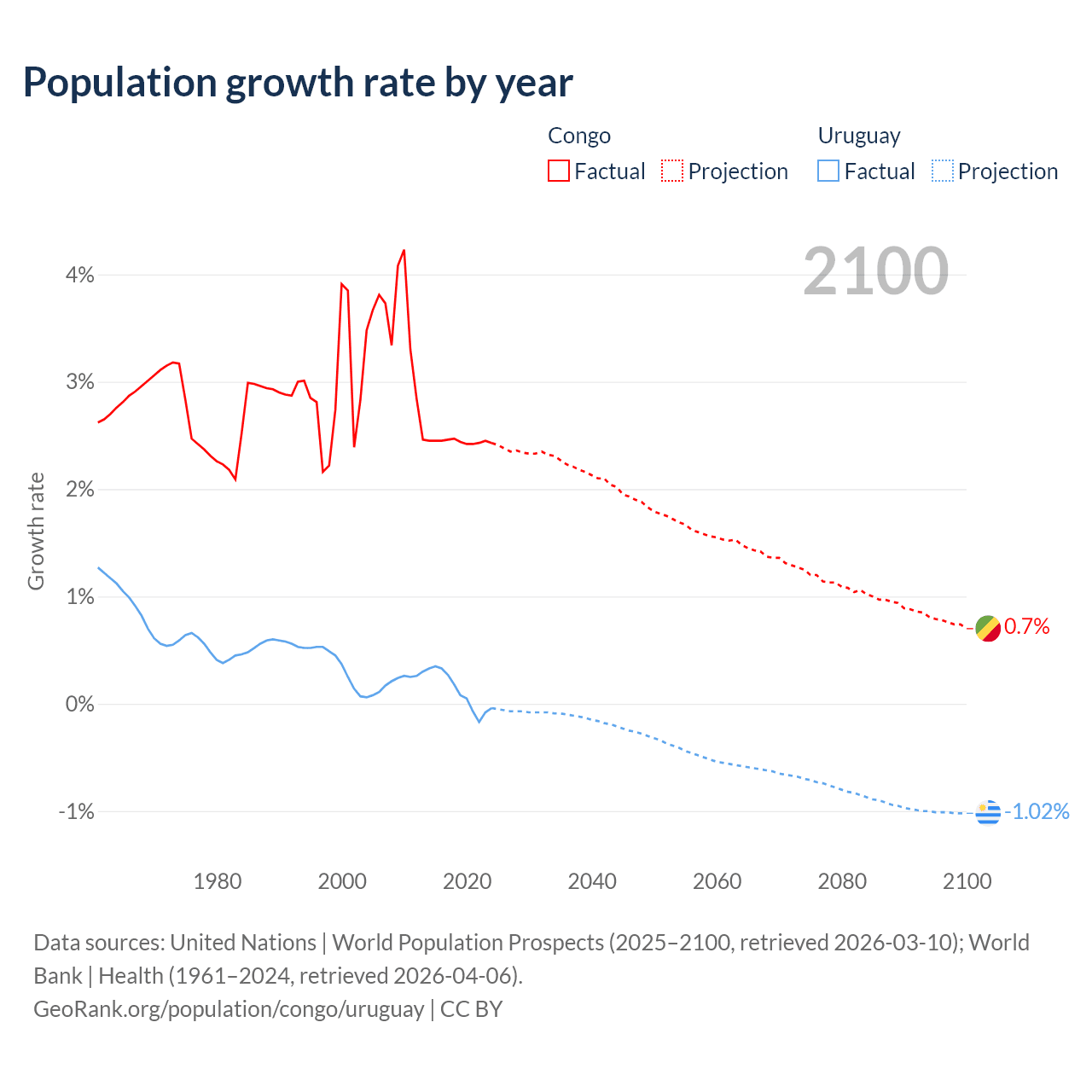 - For the last 10 years, the Congo has had an average growth rate of +2.44% per year vs +0.11% in Uruguay.