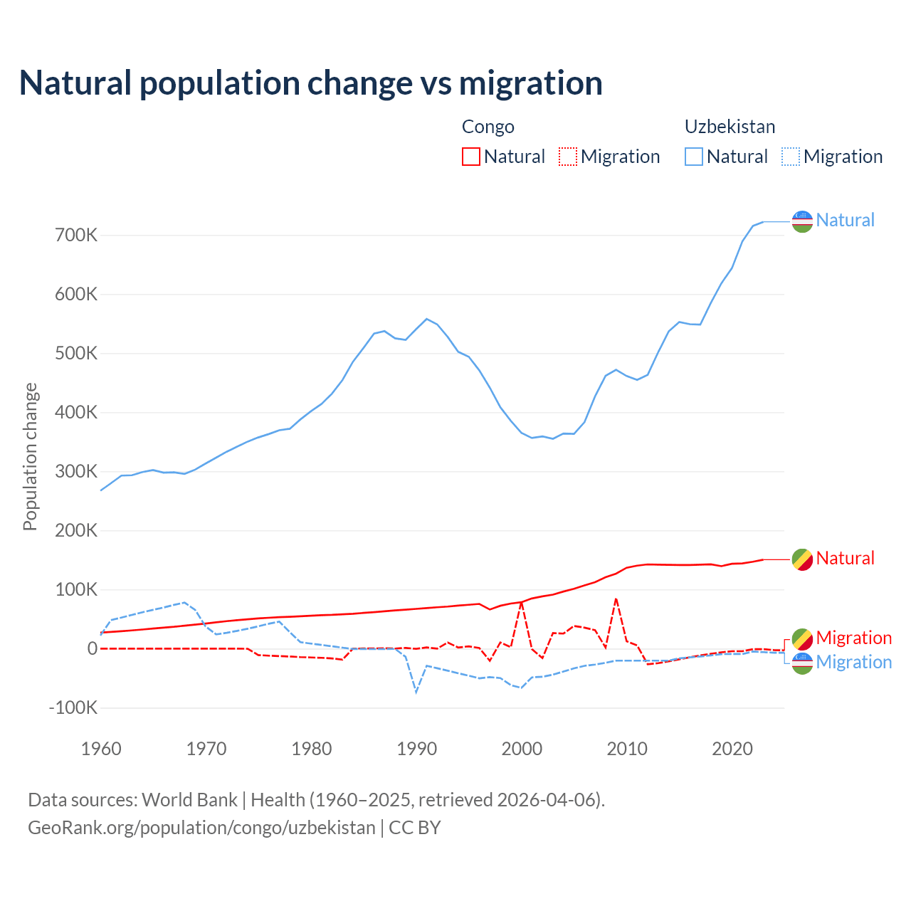 Over the last 10 years, 94% of the population change in the Congo is from natural causes (a gain of 1,434,056 people) and 6.04% is from migration (a loss of 92,251 people). In Uzbekistan 98.2% is from natural causes (a gain of 6,161,117 people) and 1.84% is from migration (a loss of 115,398 people).