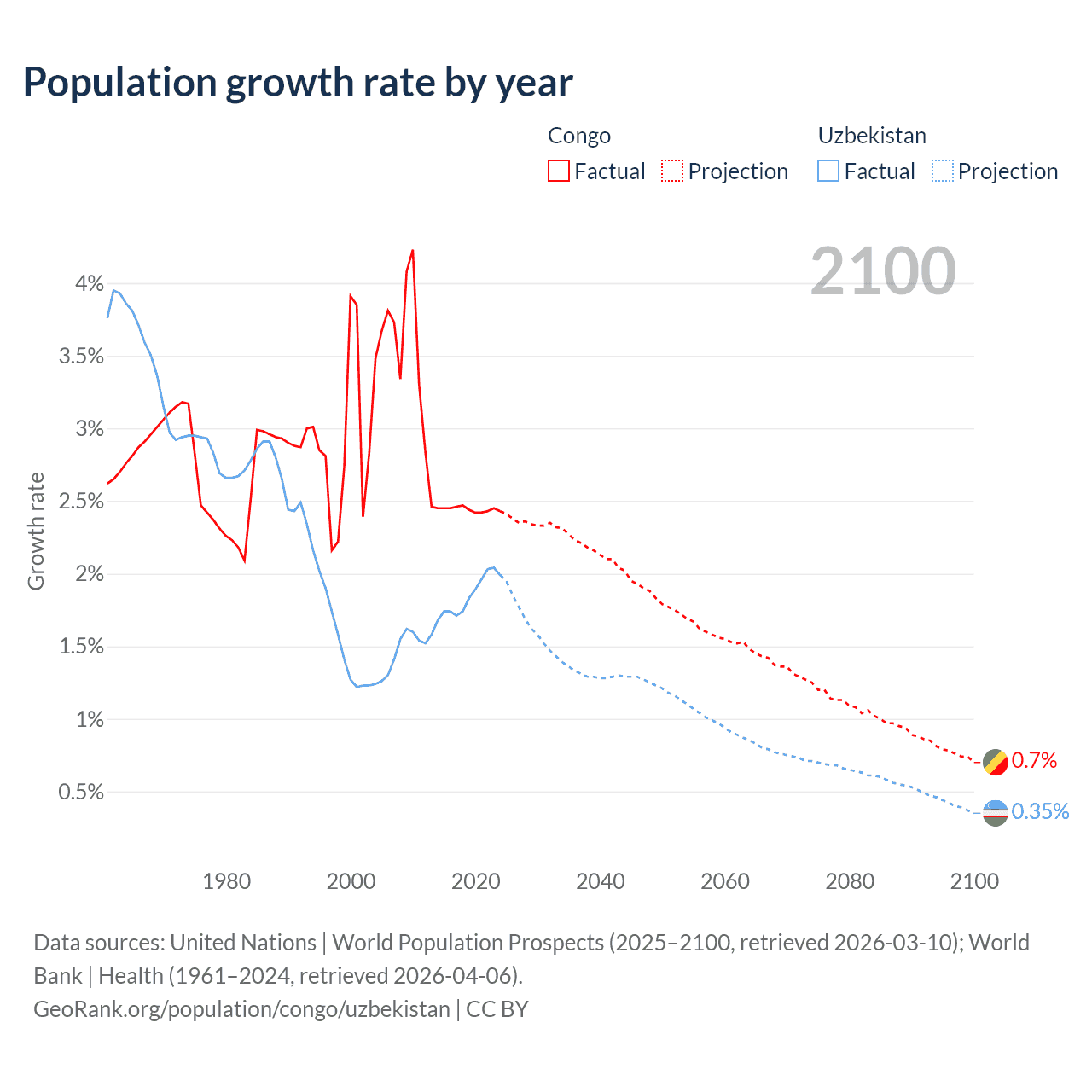 - For the last 10 years, the Congo has had an average growth rate of +2.44% per year vs +1.85% in Uzbekistan.
