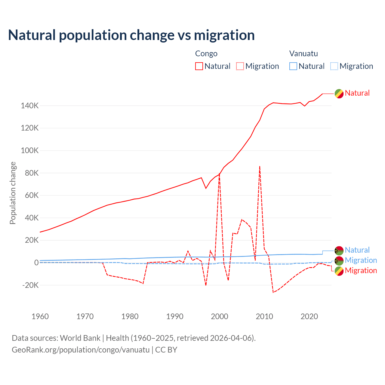 Over the last 10 years, 94% of the population change in the Congo is from natural causes (a gain of 1,434,056 people) and 6.04% is from migration (a loss of 92,251 people). In Vanuatu 92.2% is from natural causes (a gain of 72,941 people) and 7.81% is from migration (a loss of 6,181 people).