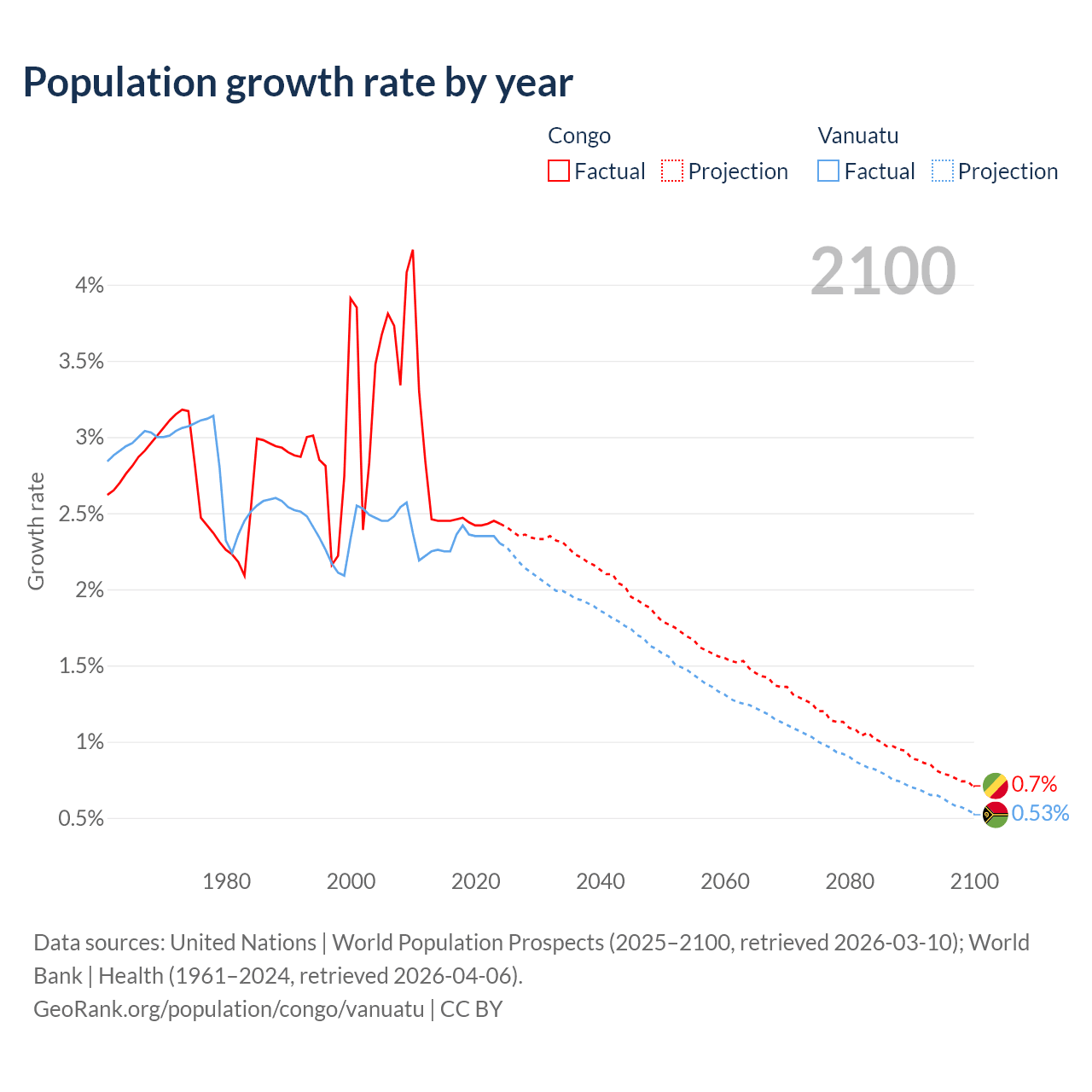 - For the last 10 years, the Congo has had an average growth rate of +2.44% per year vs +2.33% in Vanuatu.