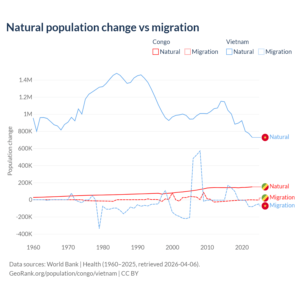 Over the last 10 years, 94% of the population change in the Congo is from natural causes (a gain of 1,434,056 people) and 6.04% is from migration (a loss of 92,251 people). In Vietnam 97.7% is from natural causes (a gain of 9,349,756 people) and 2.29% is from migration (a gain of 219,073 people).