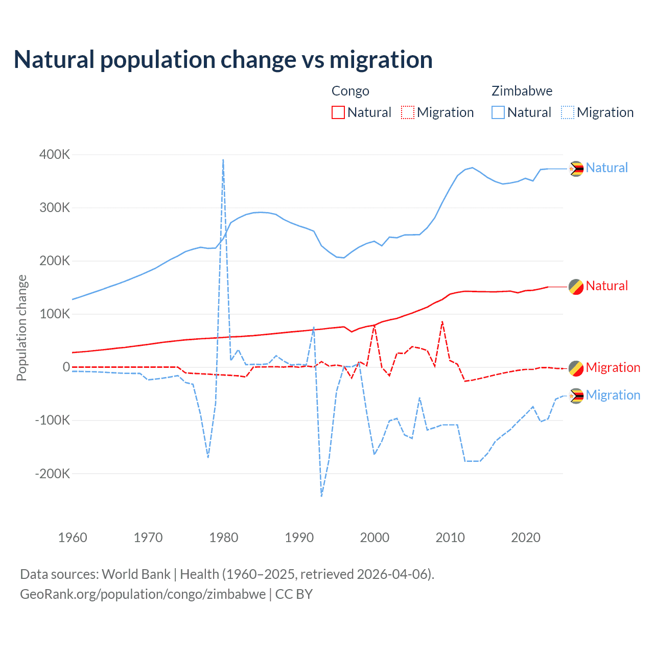Over the last 10 years, 94% of the population change in the Congo is from natural causes (a gain of 1,434,056 people) and 6.04% is from migration (a loss of 92,251 people). In Zimbabwe 74.9% is from natural causes (a gain of 3,558,487 people) and 25.1% is from migration (a loss of 1,192,807 people).