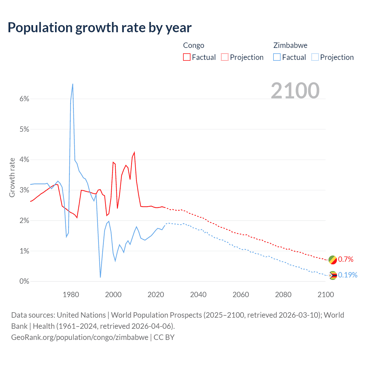 - For the last 10 years, the Congo has had an average growth rate of +2.44% per year vs +1.57% in Zimbabwe.