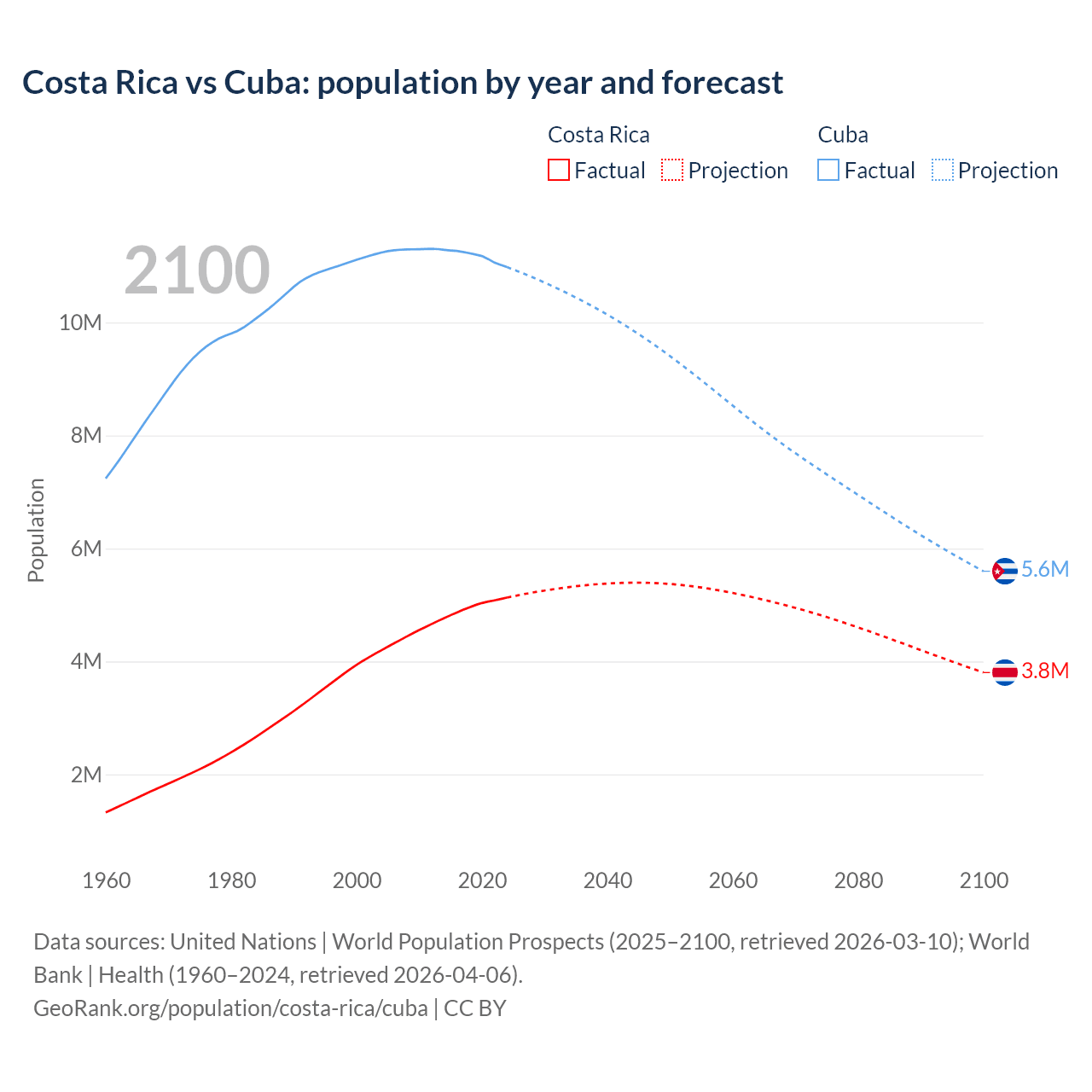 The latest officially reported population of Costa Rica was 5,129,910 in 2024 vs 10,979,783 people in Cuba in 2024. In 2026, based on the adjusted UN estimation, the current Costa Rica's population is 5,181,862 people compared to 10,894,785 in Cuba.