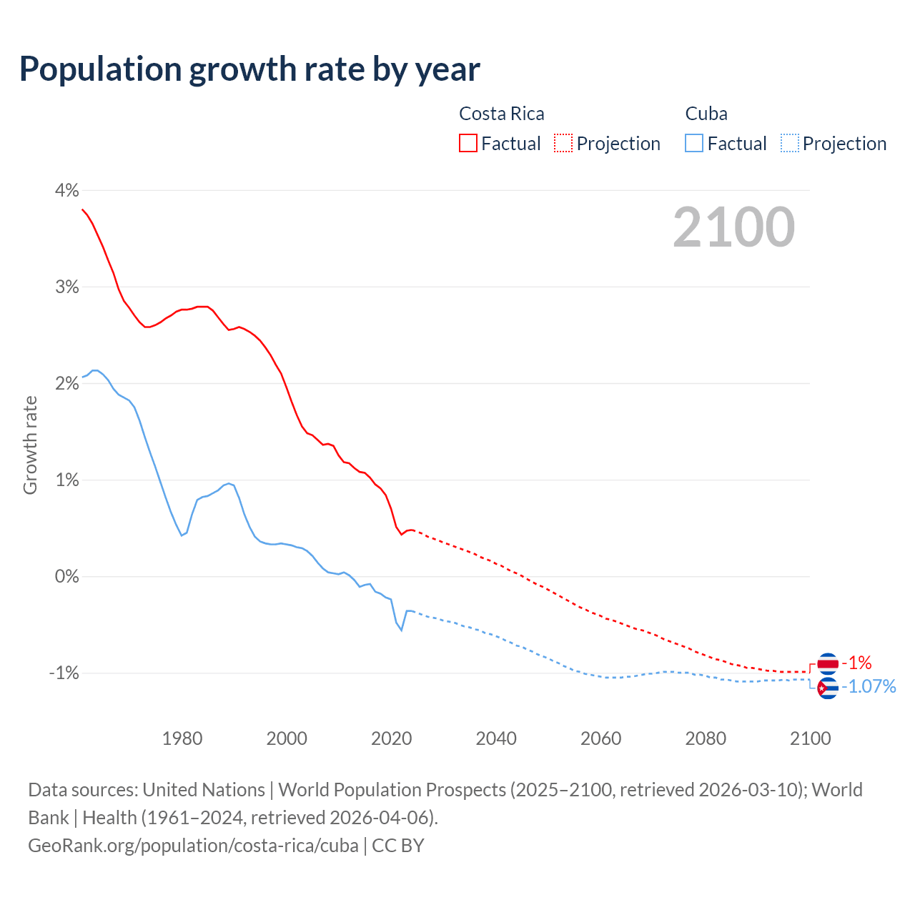 - For the last 10 years, Costa Rica has had an average growth rate of +0.77% per year vs -0.26% in Cuba.