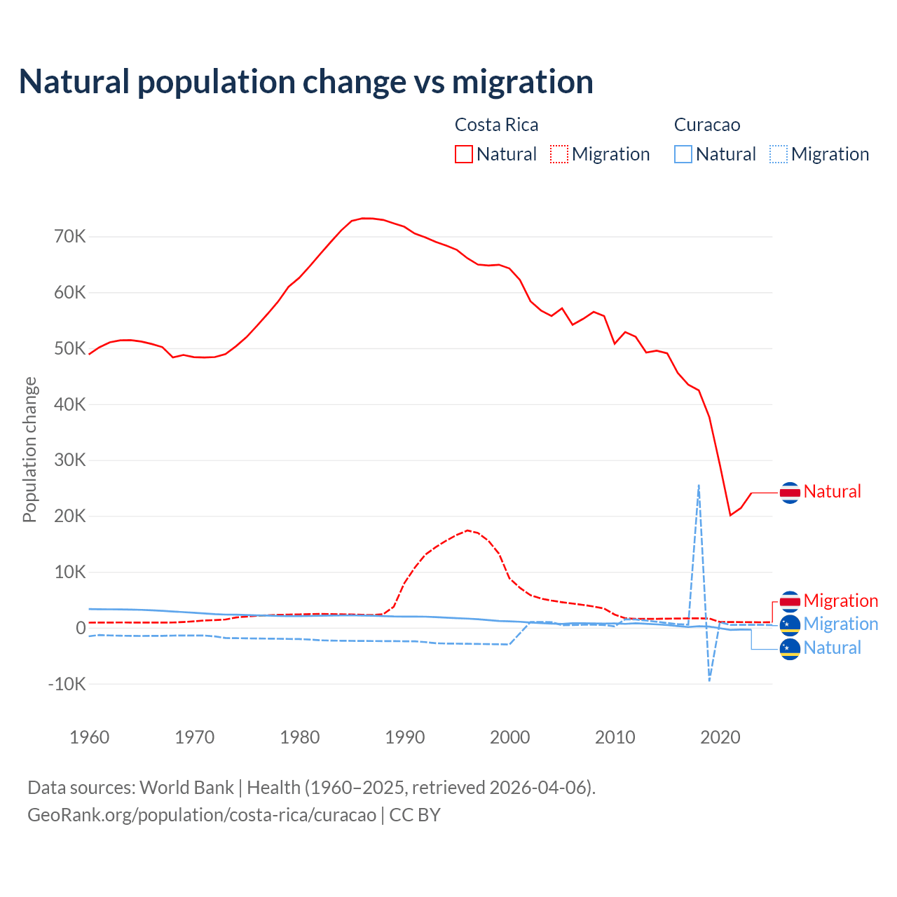 Over the last 10 years, 96.3% of the population change in Costa Rica is from natural causes (a gain of 362,624 people) and 3.69% is from migration (a gain of 13,900 people). In Curacao 3.72% is from natural causes (a gain of 834 people) and 96.3% is from migration (a gain of 21,615 people).