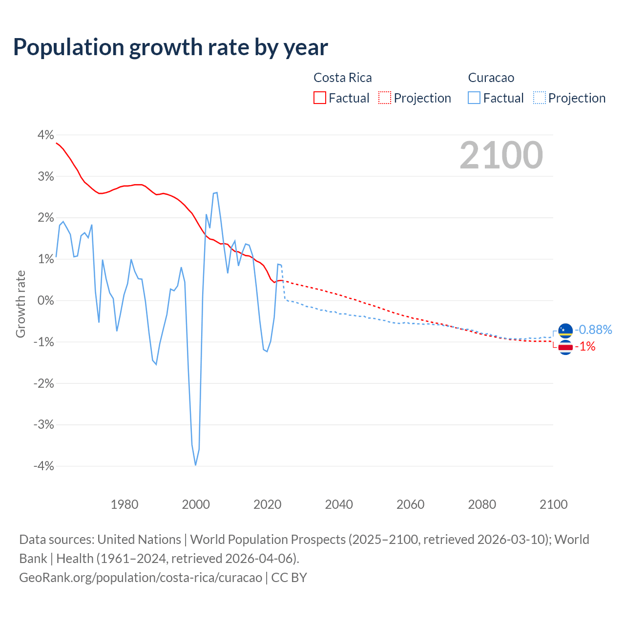 - For the last 10 years, Costa Rica has had an average growth rate of +0.77% per year vs +0.13% in Curacao.