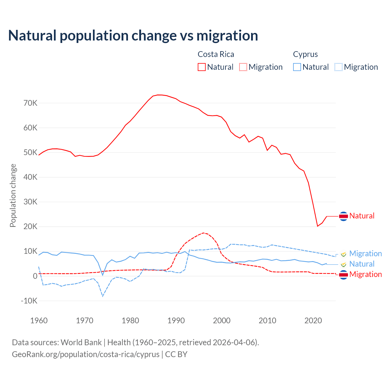 Over the last 10 years, 96.3% of the population change in Costa Rica is from natural causes (a gain of 362,624 people) and 3.69% is from migration (a gain of 13,900 people). In Cyprus 36.2% is from natural causes (a gain of 57,464 people) and 63.8% is from migration (a gain of 101,458 people).