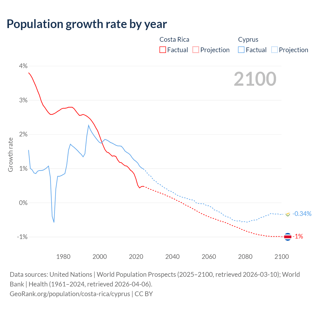 Costa Rica vs Cyprus: population by year and forecast