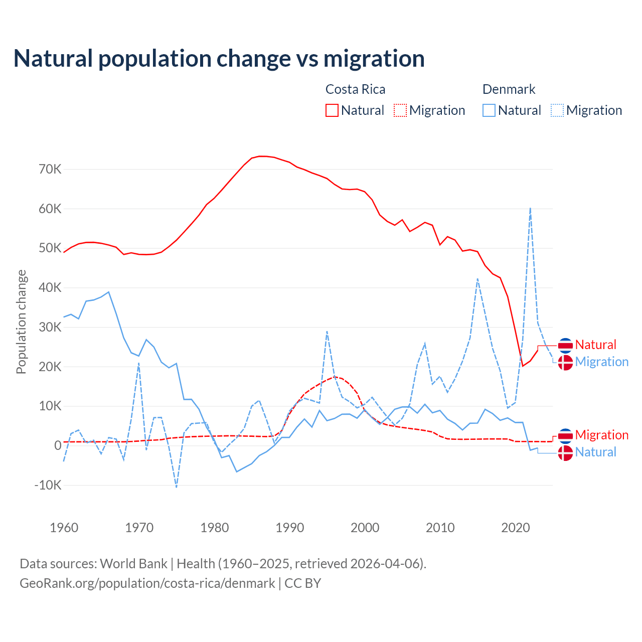 Over the last 10 years, 96.3% of the population change in Costa Rica is from natural causes (a gain of 362,624 people) and 3.69% is from migration (a gain of 13,900 people). In Denmark 15.4% is from natural causes (a gain of 51,826 people) and 84.6% is from migration (a gain of 284,848 people).