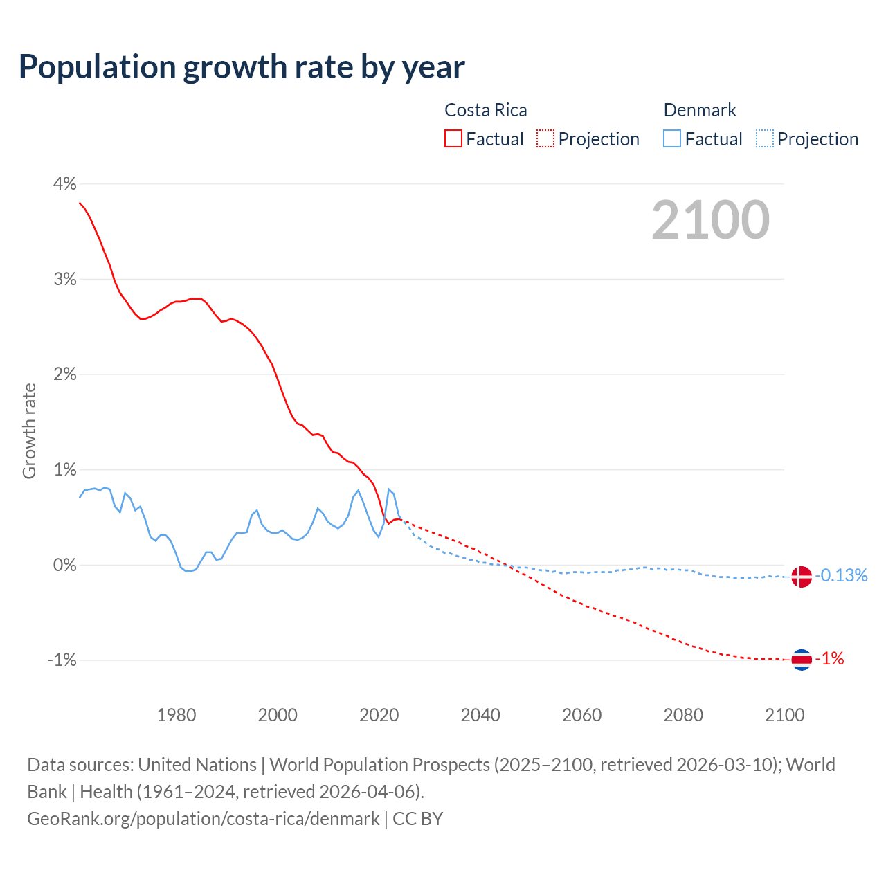 - For the last 10 years, Costa Rica has had an average growth rate of +0.77% per year vs +0.57% in Denmark.