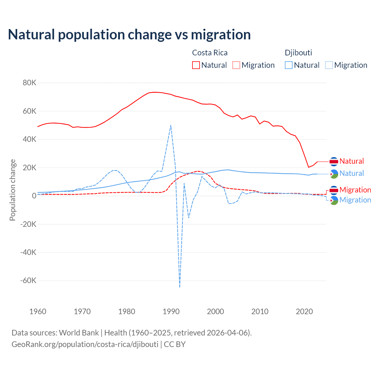 Over the last 10 years, 96.3% of the population change in Costa Rica is from natural causes (a gain of 362,624 people) and 3.69% is from migration (a gain of 13,900 people). In Djibouti 92.1% is from natural causes (a gain of 153,892 people) and 7.87% is from migration (a gain of 13,138 people).