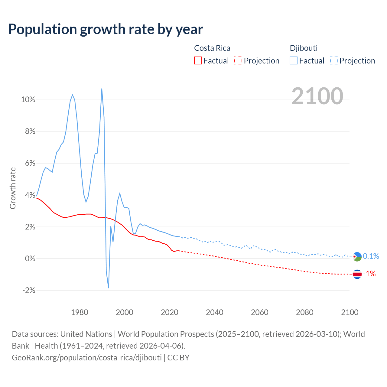 - For the last 10 years, Costa Rica has had an average growth rate of +0.77% per year vs +1.57% in Djibouti.