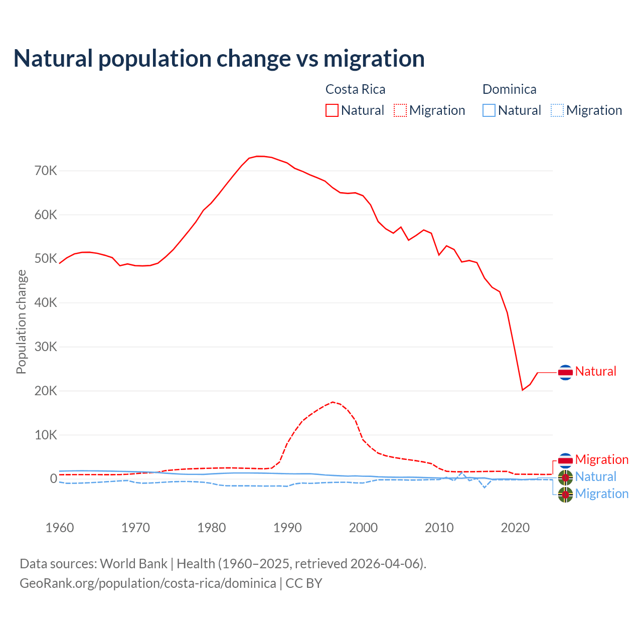Over the last 10 years, 96.3% of the population change in Costa Rica is from natural causes (a gain of 362,624 people) and 3.69% is from migration (a gain of 13,900 people). In Dominica 4.63% is from natural causes (a loss of 190 people) and 95.4% is from migration (a loss of 3,914 people).