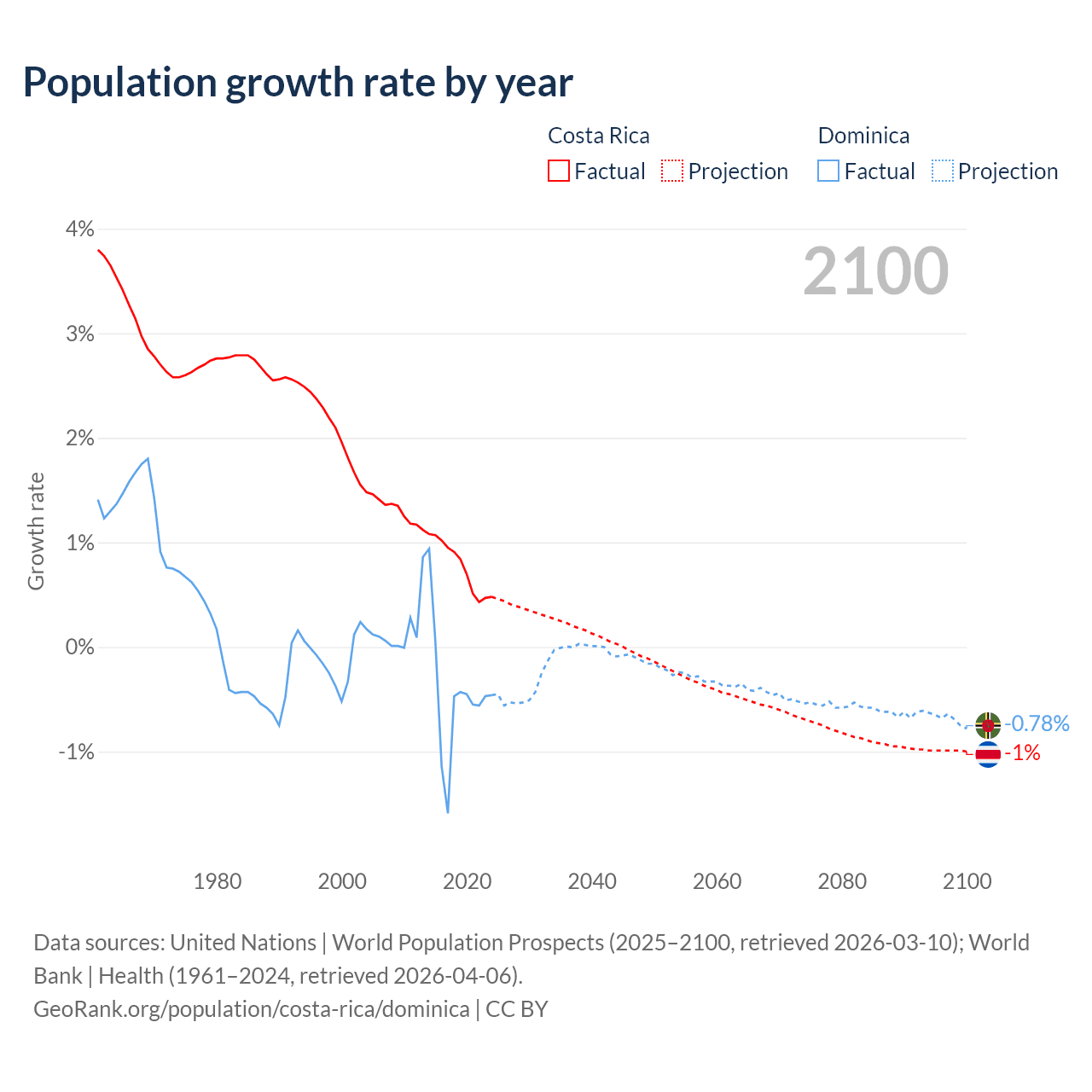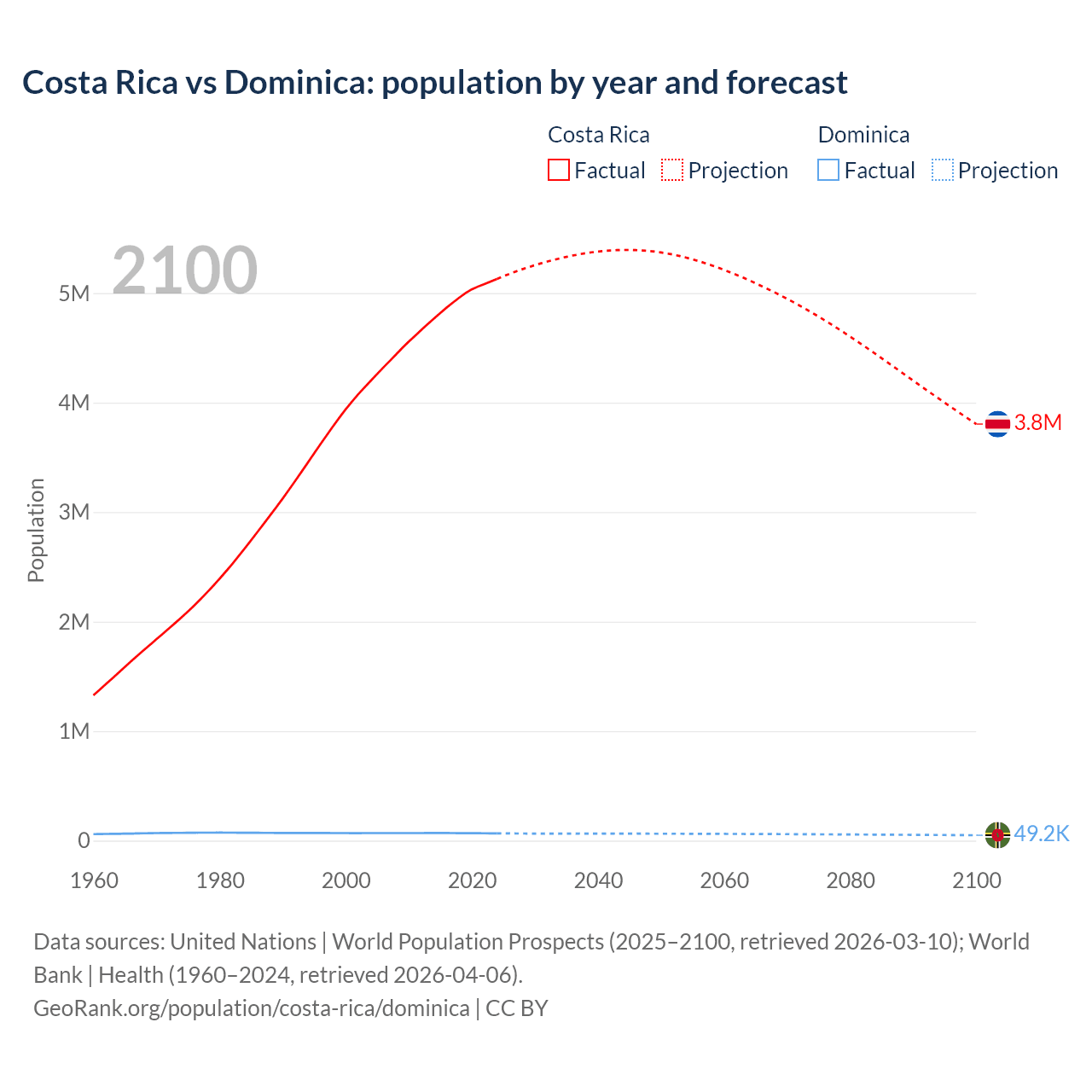 Costa Rica vs Dominica: population by year and forecast