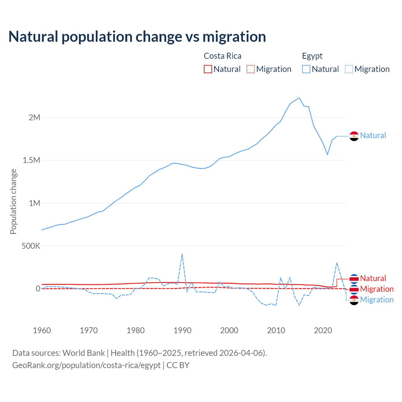 Over the last 10 years, 96.3% of the population change in Costa Rica is from natural causes (a gain of 362,624 people) and 3.69% is from migration (a gain of 13,900 people). In Egypt 99.6% is from natural causes (a gain of 19,180,073 people) and 0.41% is from migration (a loss of 78,975 people).