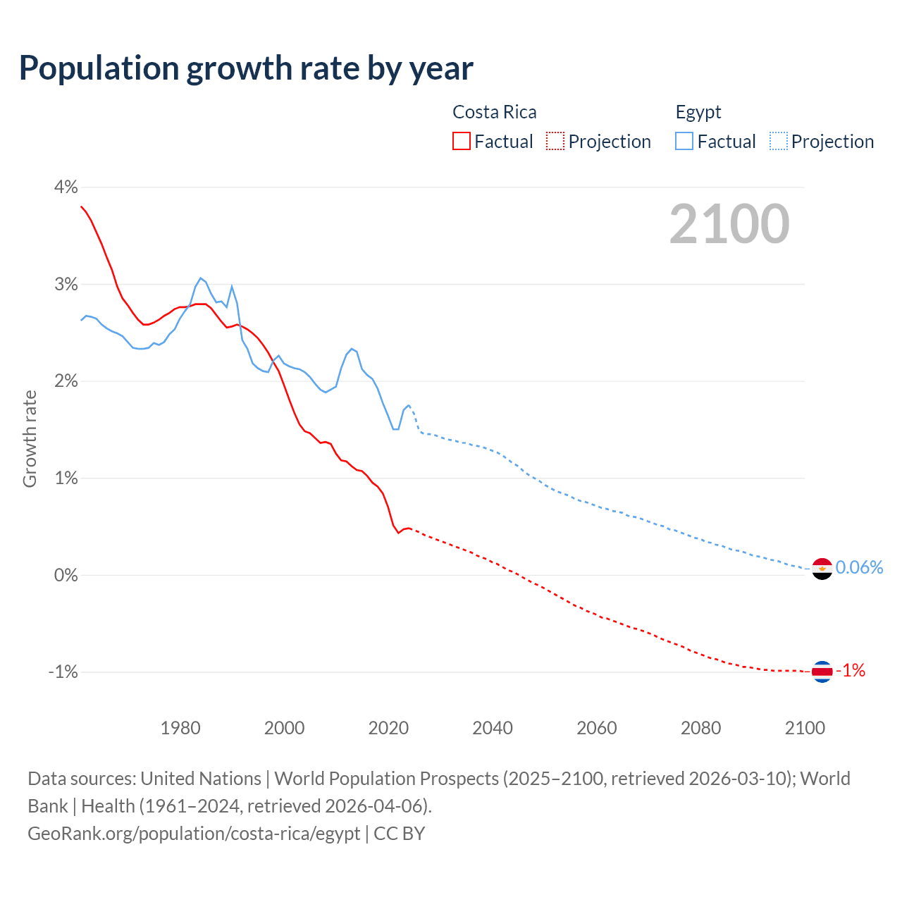 - For the last 10 years, Costa Rica has had an average growth rate of +0.77% per year vs +1.84% in Egypt.