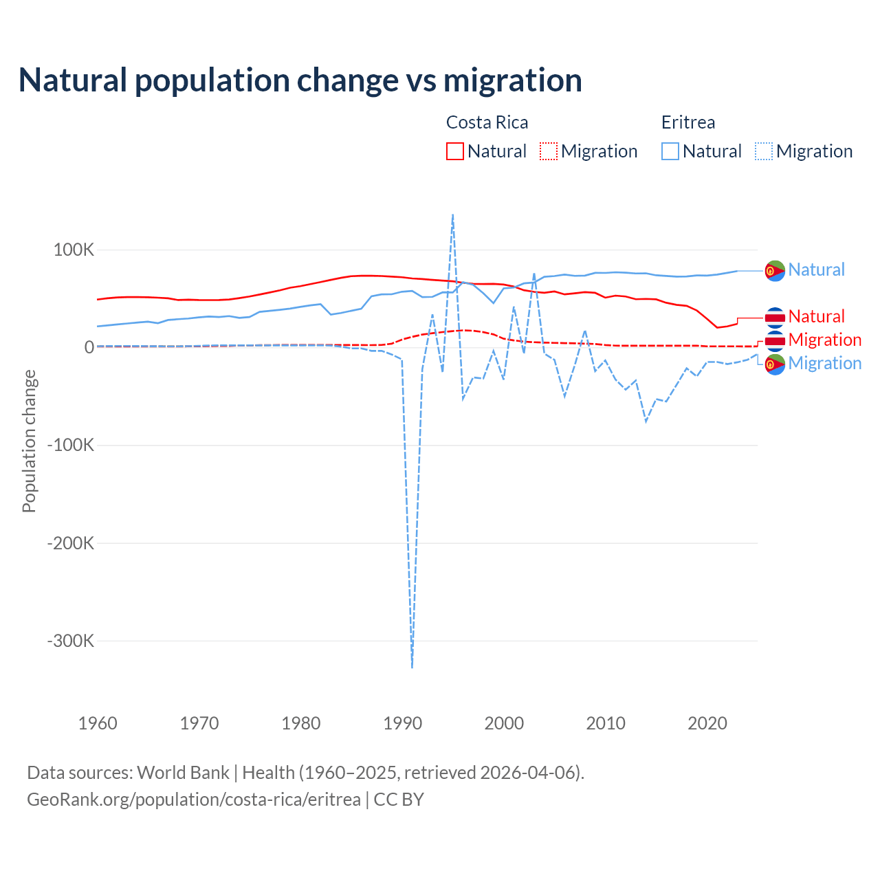 Over the last 10 years, 96.3% of the population change in Costa Rica is from natural causes (a gain of 362,624 people) and 3.69% is from migration (a gain of 13,900 people). In Eritrea 68.8% is from natural causes (a gain of 742,837 people) and 31.2% is from migration (a loss of 336,243 people).