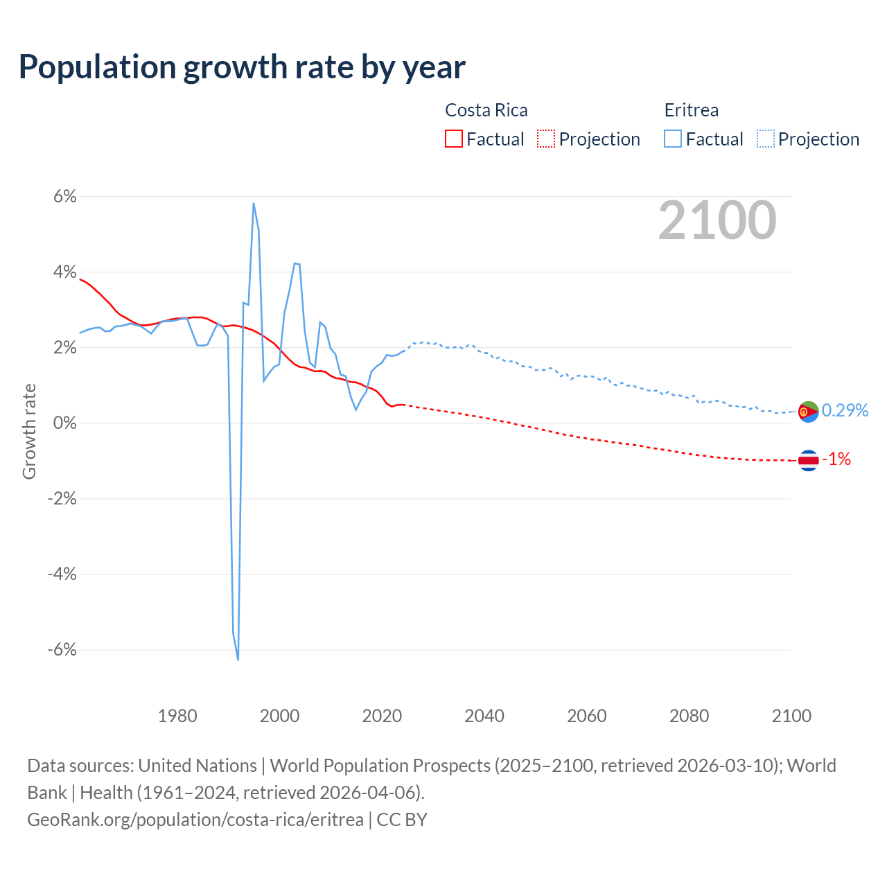 - For the last 10 years, Costa Rica has had an average growth rate of +0.77% per year vs +1.28% in Eritrea.