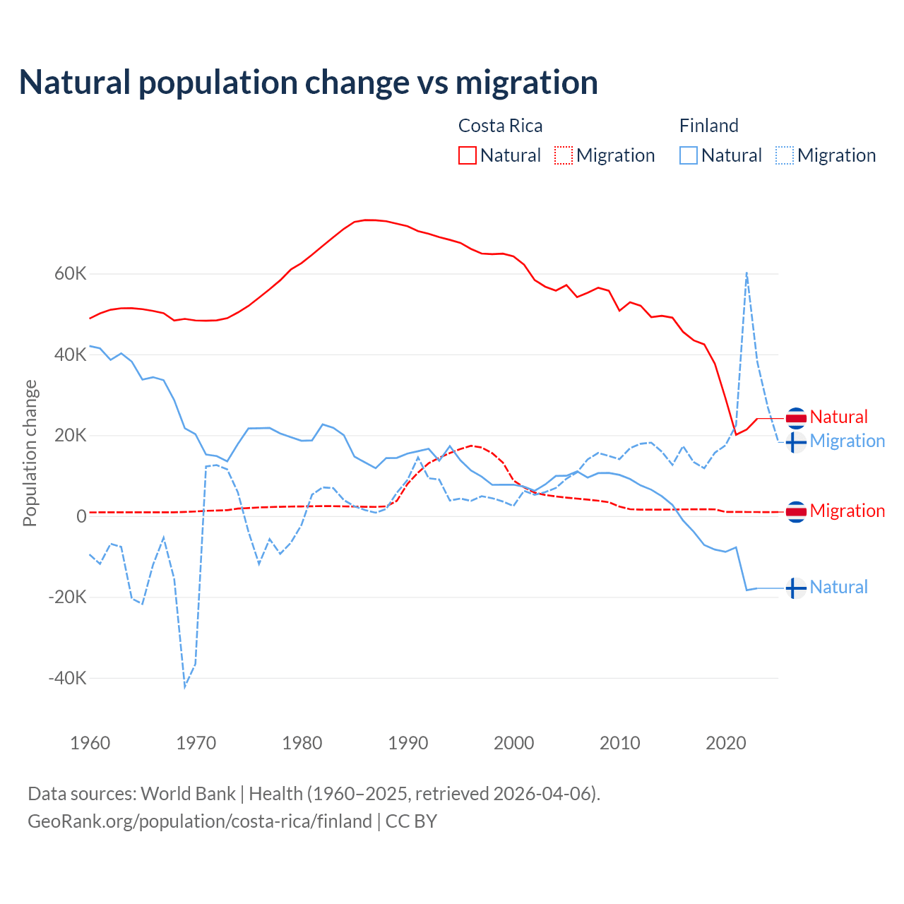 Over the last 10 years, 96.3% of the population change in Costa Rica is from natural causes (a gain of 362,624 people) and 3.69% is from migration (a gain of 13,900 people). In Finland 22.5% is from natural causes (a loss of 65,560 people) and 77.5% is from migration (a gain of 225,237 people).