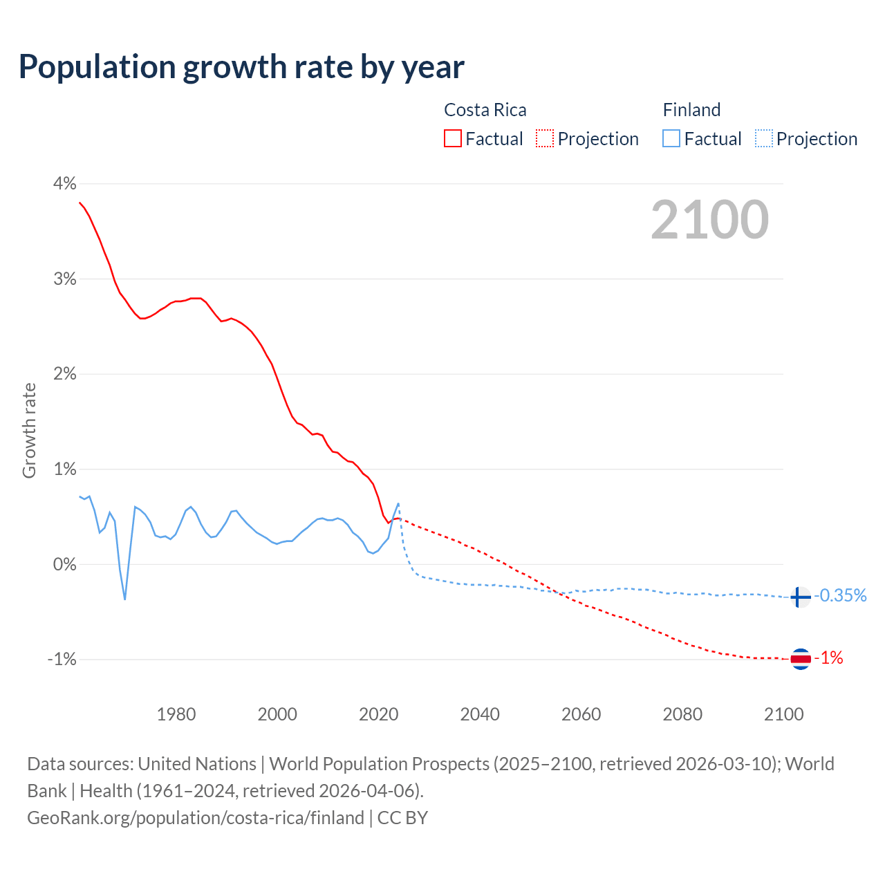 - For the last 10 years, Costa Rica has had an average growth rate of +0.77% per year vs +0.3% in Finland.