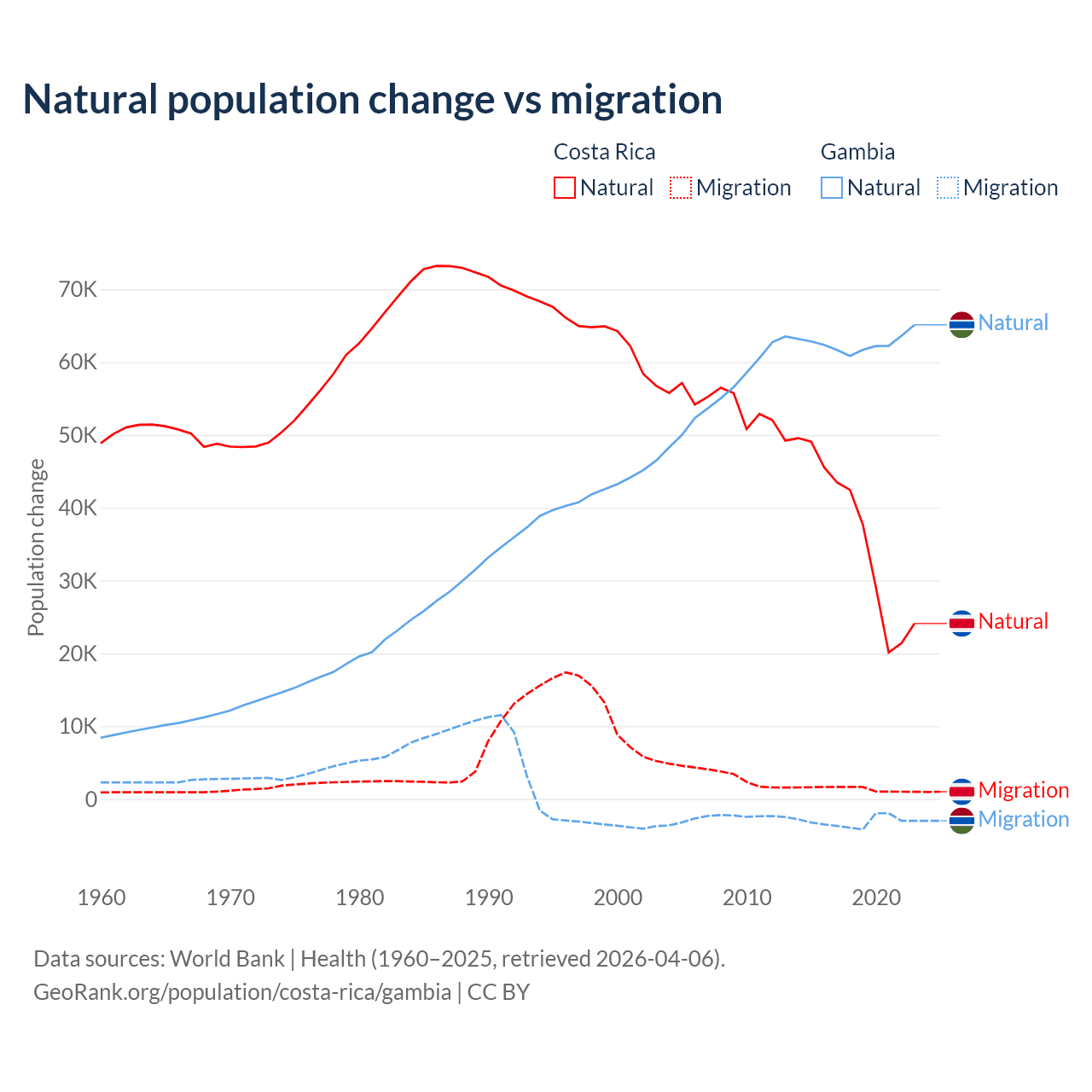 Over the last 10 years, 96.3% of the population change in Costa Rica is from natural causes (a gain of 362,624 people) and 3.69% is from migration (a gain of 13,900 people). In the Gambia 95.2% is from natural causes (a gain of 625,795 people) and 4.75% is from migration (a loss of 31,227 people).