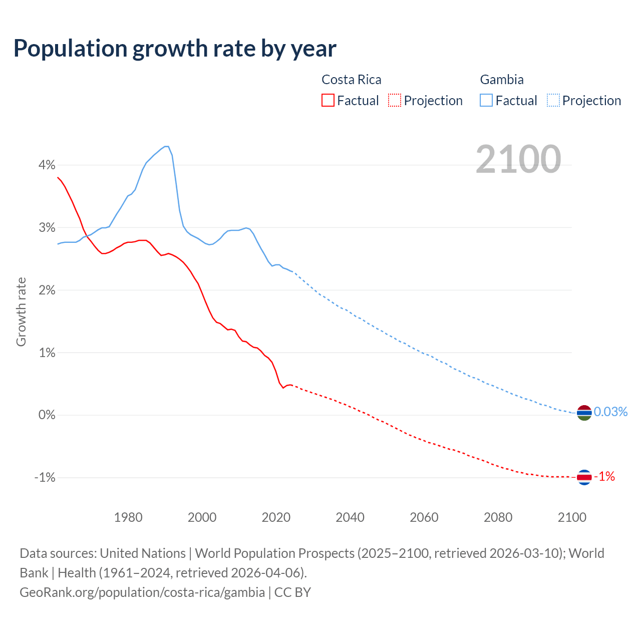 Costa Rica vs Gambia: population by year and forecast