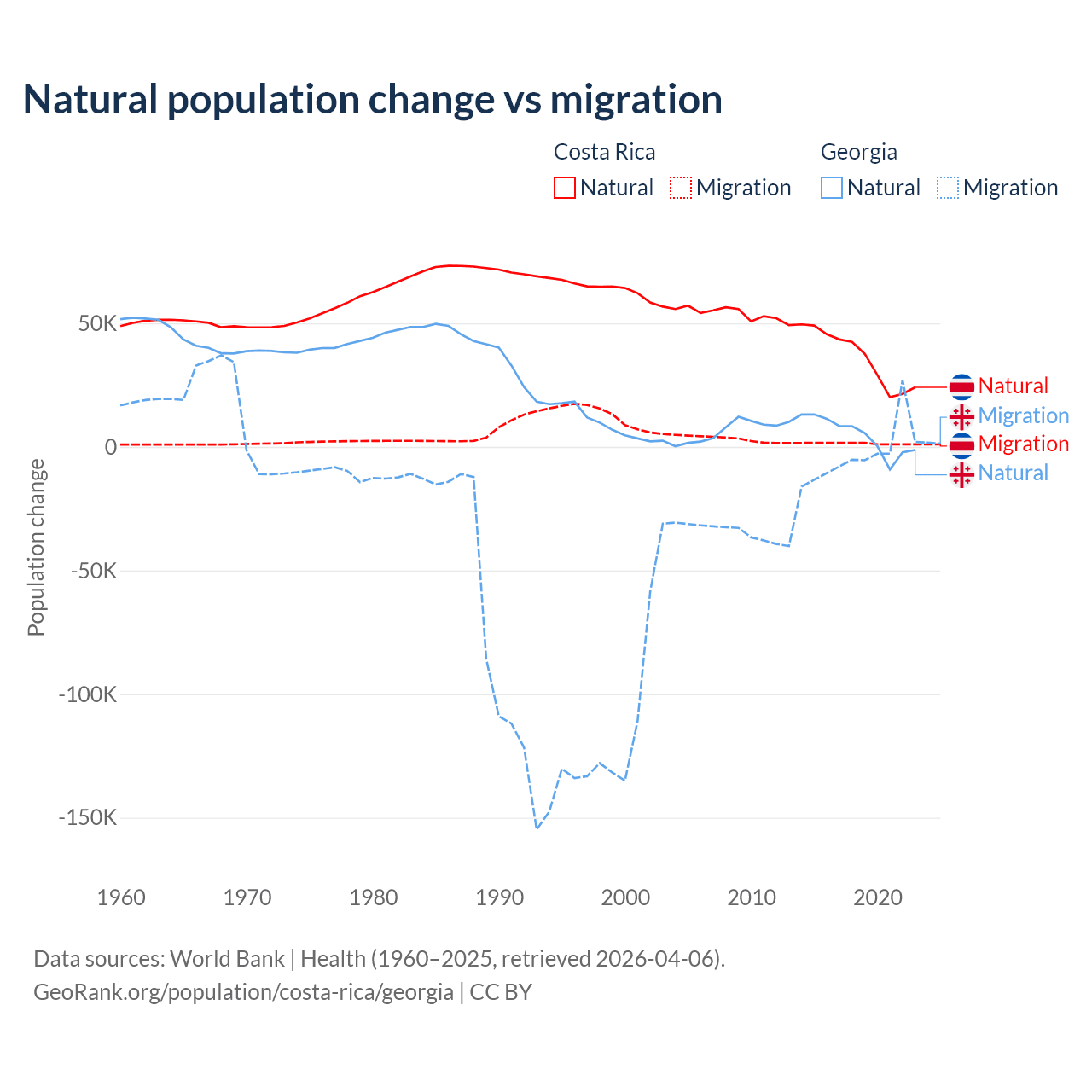 Over the last 10 years, 96.3% of the population change in Costa Rica is from natural causes (a gain of 362,624 people) and 3.69% is from migration (a gain of 13,900 people). In Georgia 57.7% is from natural causes (a gain of 47,646 people) and 42.3% is from migration (a loss of 34,907 people).
