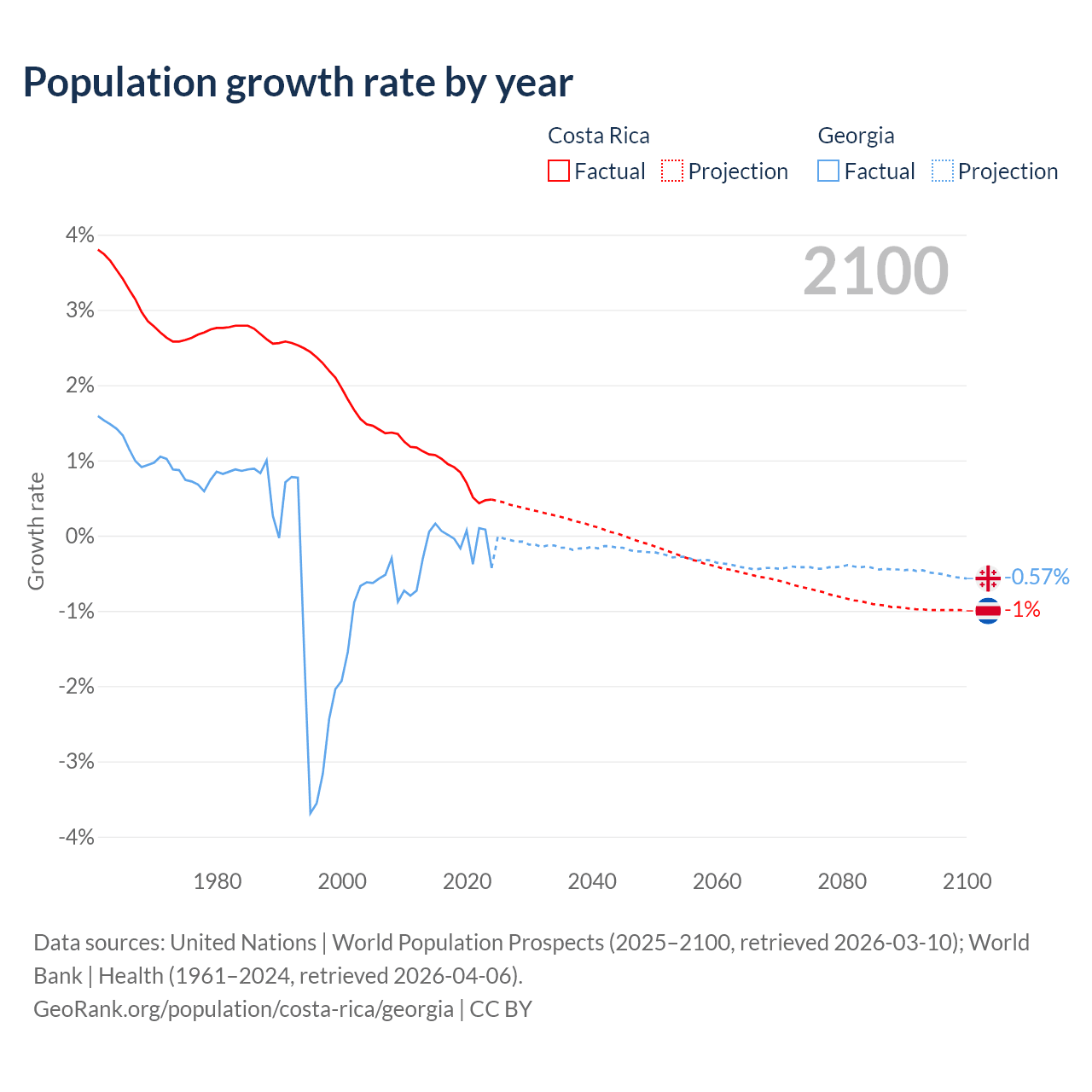 - For the last 10 years, Costa Rica has had an average growth rate of +0.77% per year vs -0.04% in Georgia.