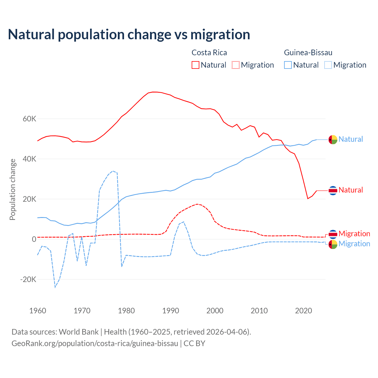 Over the last 10 years, 96.3% of the population change in Costa Rica is from natural causes (a gain of 362,624 people) and 3.69% is from migration (a gain of 13,900 people). In Guinea-Bissau 97.1% is from natural causes (a gain of 472,826 people) and 2.87% is from migration (a loss of 13,956 people).