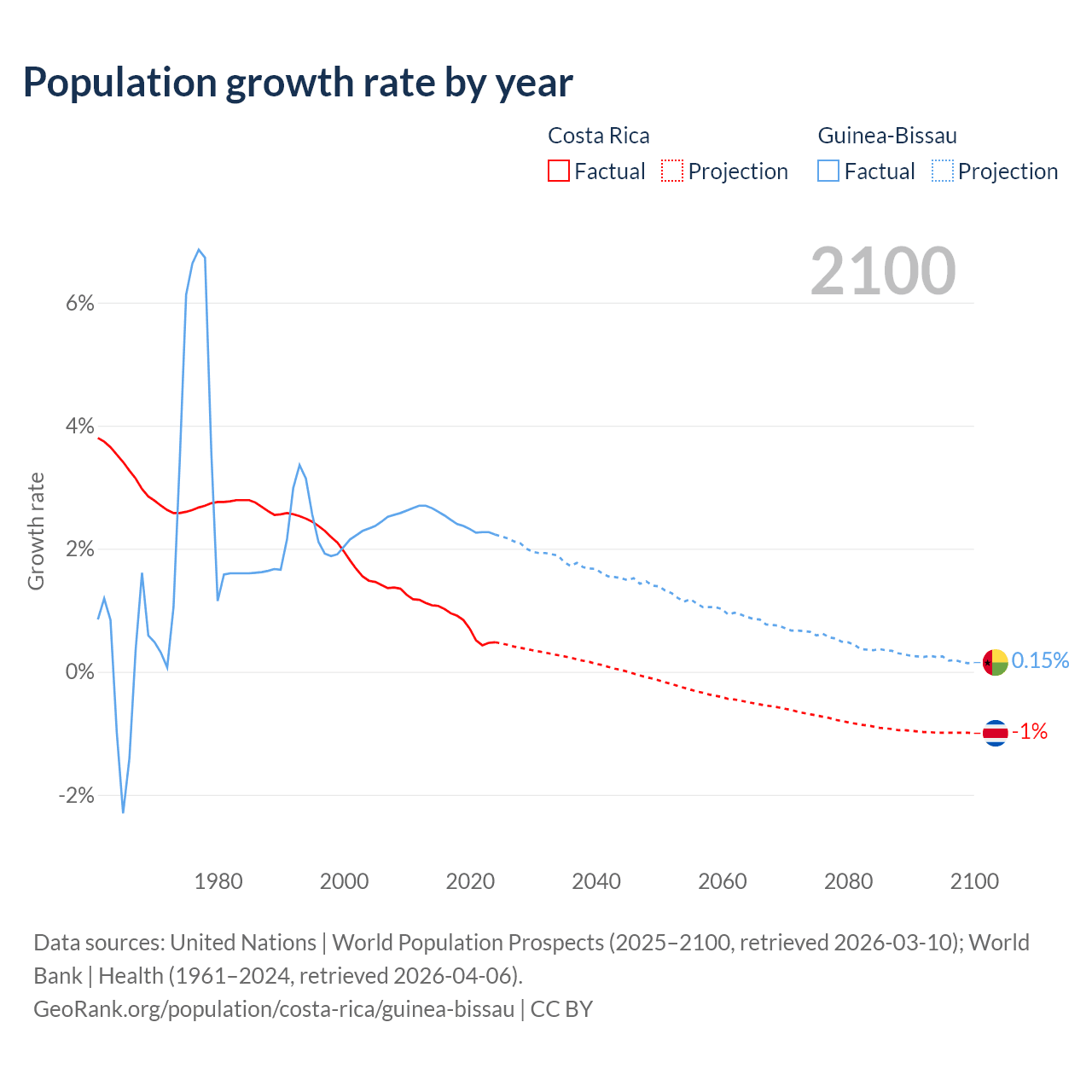 Costa Rica vs Guinea-Bissau: population by year and forecast