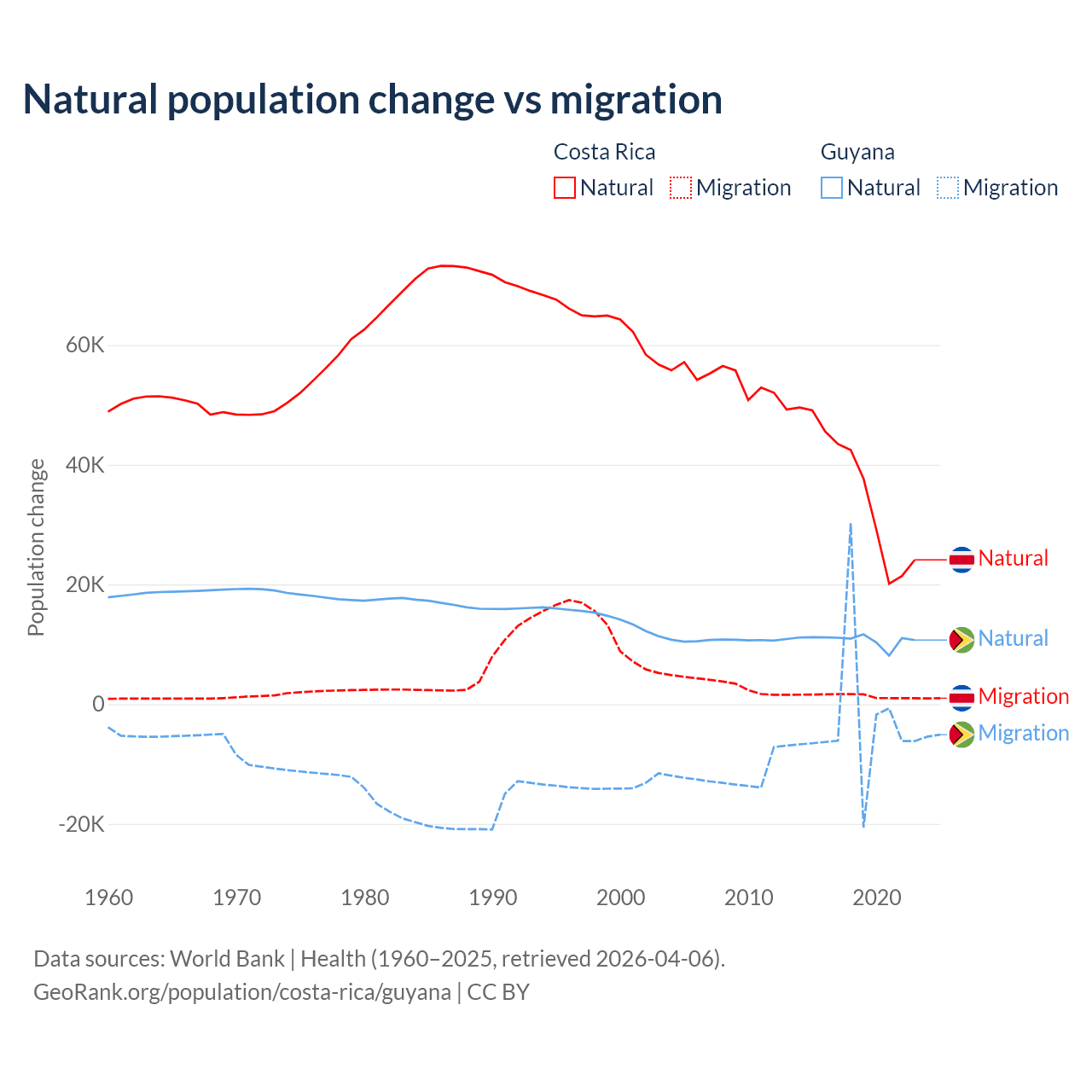 Over the last 10 years, 96.3% of the population change in Costa Rica is from natural causes (a gain of 362,624 people) and 3.69% is from migration (a gain of 13,900 people). In Guyana 77.7% is from natural causes (a gain of 107,419 people) and 22.3% is from migration (a loss of 30,797 people).