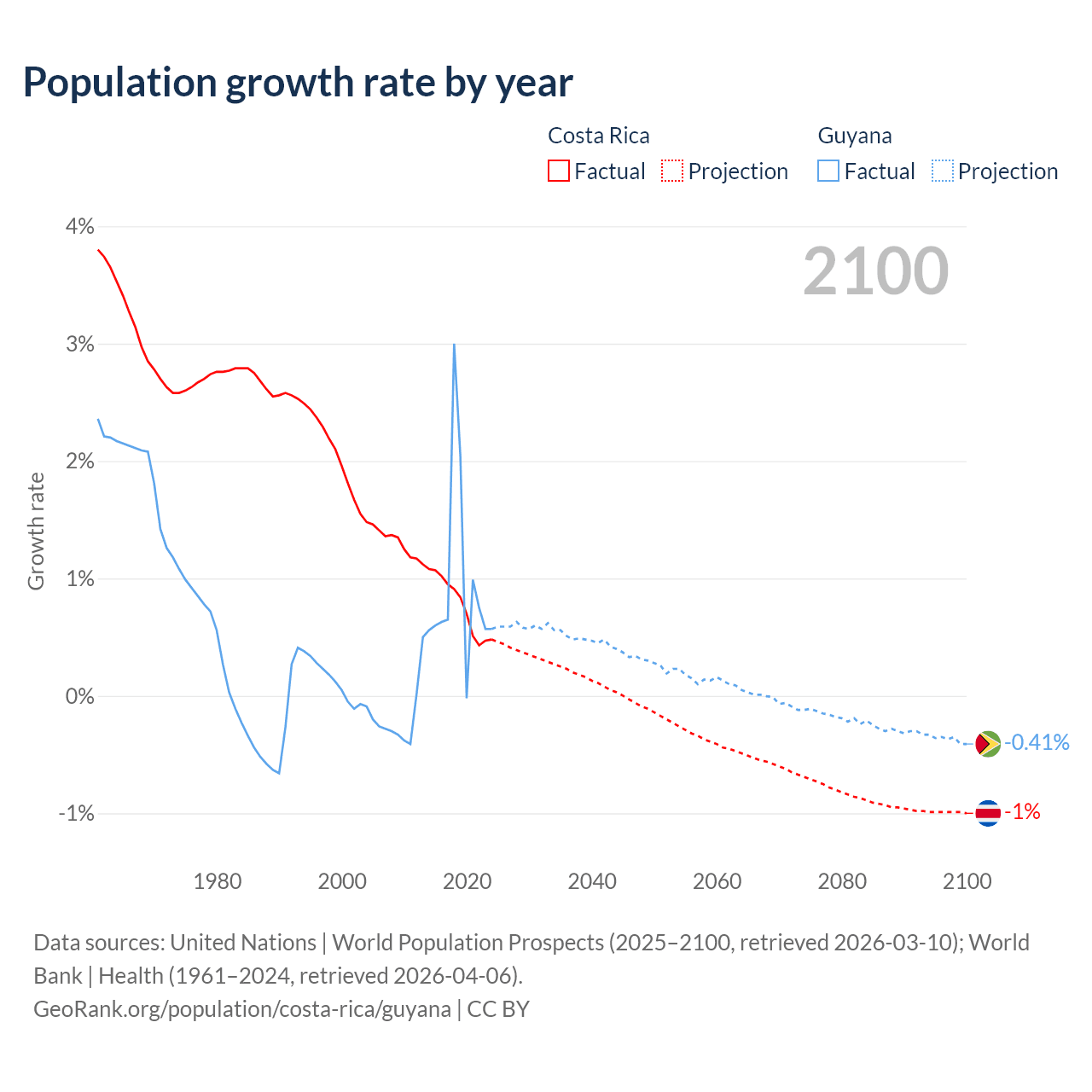 Costa Rica vs Guyana: population by year and forecast