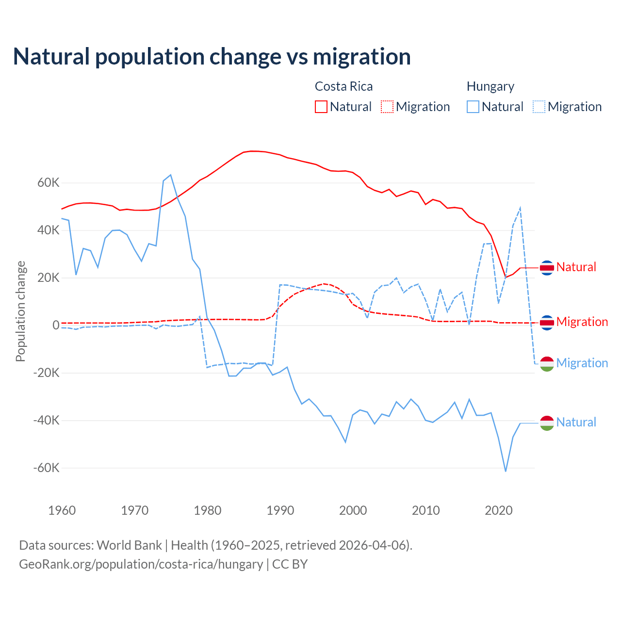 Over the last 10 years, 96.3% of the population change in Costa Rica is from natural causes (a gain of 362,624 people) and 3.69% is from migration (a gain of 13,900 people). In Hungary 63.7% is from natural causes (a loss of 412,838 people) and 36.3% is from migration (a gain of 234,837 people).