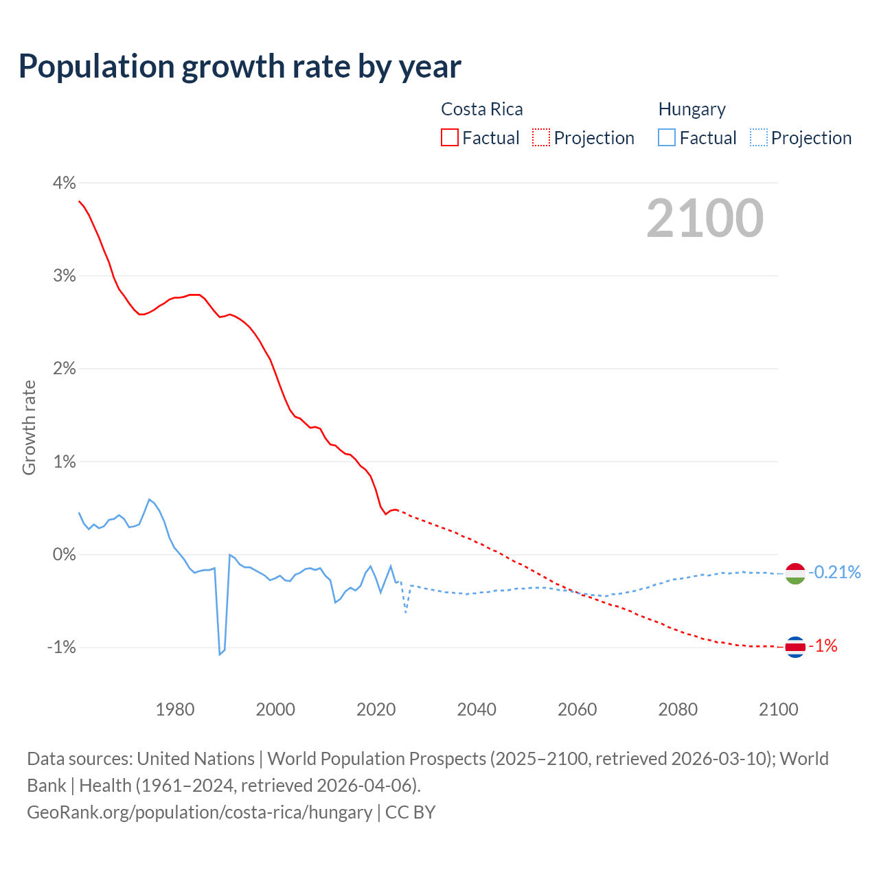 - For the last 10 years, Costa Rica has had an average growth rate of +0.77% per year vs -0.29% in Hungary.