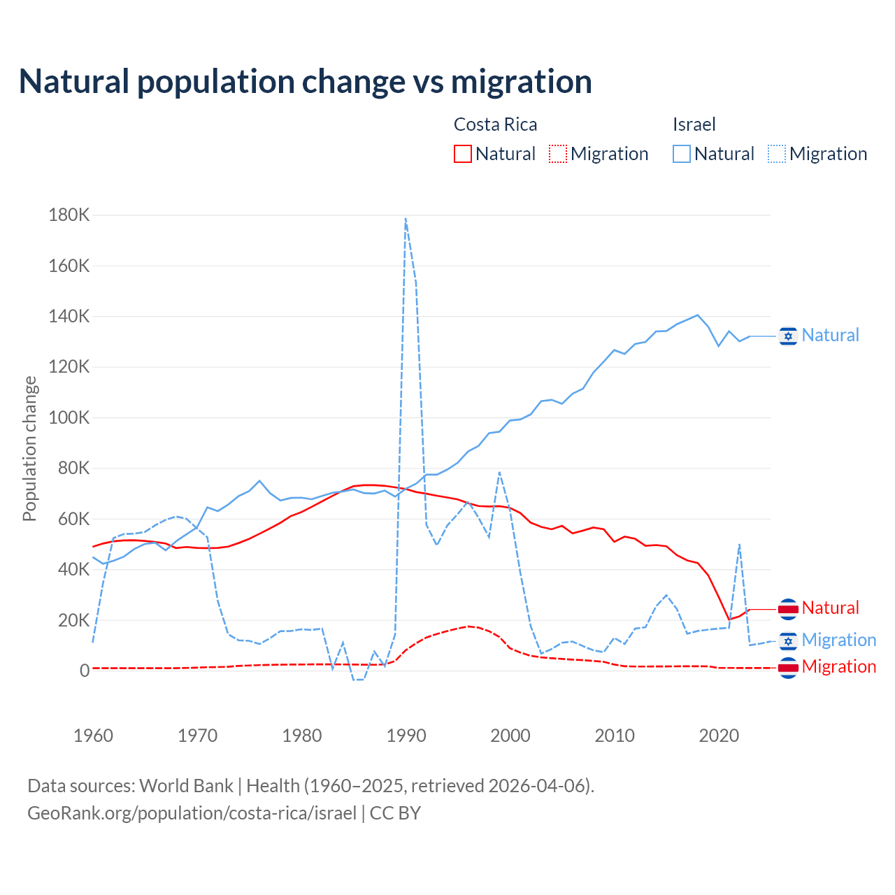 Over the last 10 years, 96.3% of the population change in Costa Rica is from natural causes (a gain of 362,624 people) and 3.69% is from migration (a gain of 13,900 people). In Israel 86% is from natural causes (a gain of 1,343,492 people) and 14% is from migration (a gain of 219,048 people).