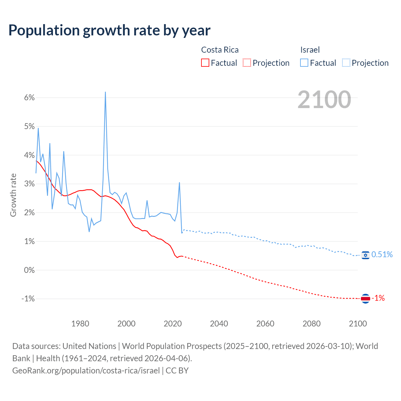 - For the last 10 years, Costa Rica has had an average growth rate of +0.77% per year vs +1.96% in Israel.