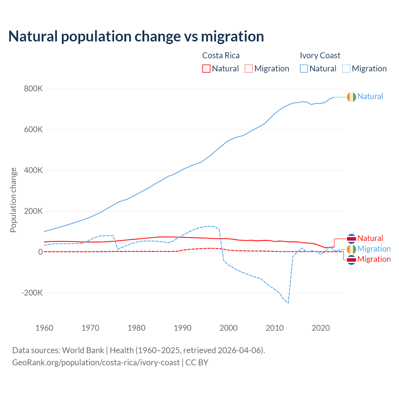 Over the last 10 years, 96.3% of the population change in Costa Rica is from natural causes (a gain of 362,624 people) and 3.69% is from migration (a gain of 13,900 people). In Ivory Coast 99.7% is from natural causes (a gain of 7,348,944 people) and 0.33% is from migration (a gain of 24,432 people).