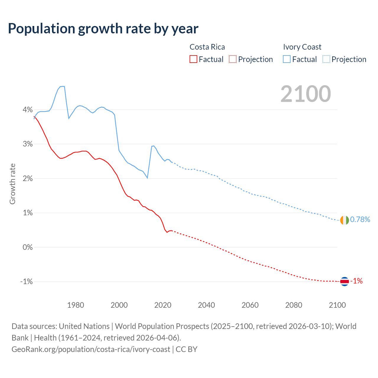 Costa Rica vs Ivory Coast: population by year and forecast