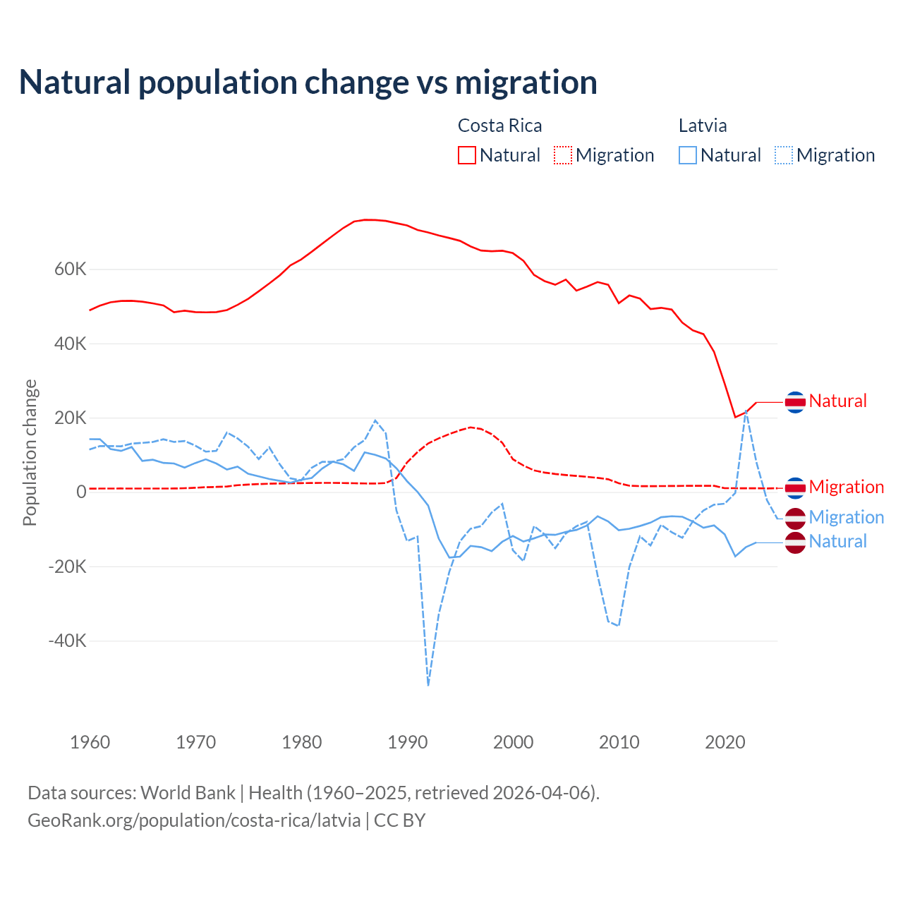 Over the last 10 years, 96.3% of the population change in Costa Rica is from natural causes (a gain of 362,624 people) and 3.69% is from migration (a gain of 13,900 people). In Latvia 82.7% is from natural causes (a loss of 103,711 people) and 17.3% is from migration (a loss of 21,641 people).