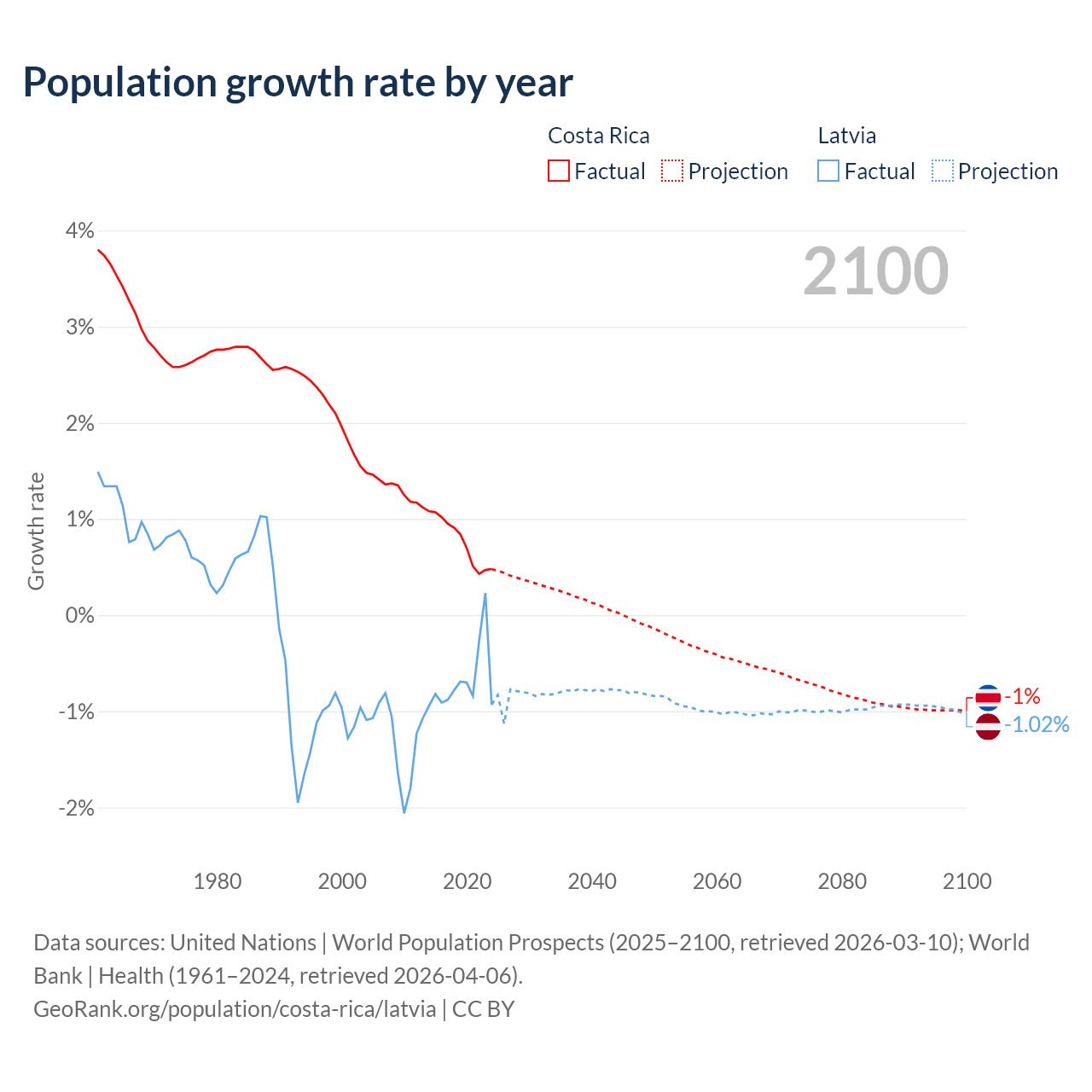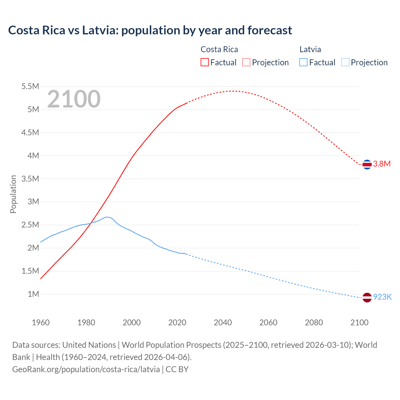 Costa Rica vs Latvia: population by year and forecast
