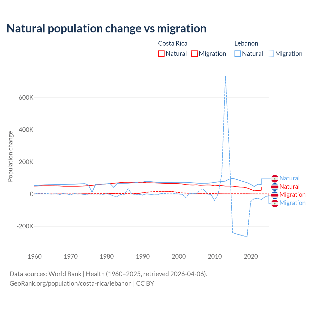 Over the last 10 years, 96.3% of the population change in Costa Rica is from natural causes (a gain of 362,624 people) and 3.69% is from migration (a gain of 13,900 people). In Lebanon 40.1% is from natural causes (a gain of 739,256 people) and 59.9% is from migration (a loss of 1,103,772 people).