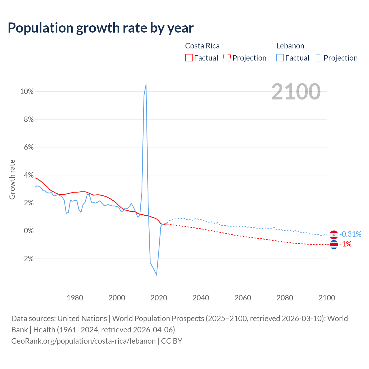 - For the last 10 years, Costa Rica has had an average growth rate of +0.77% per year vs +0.16% in Lebanon.