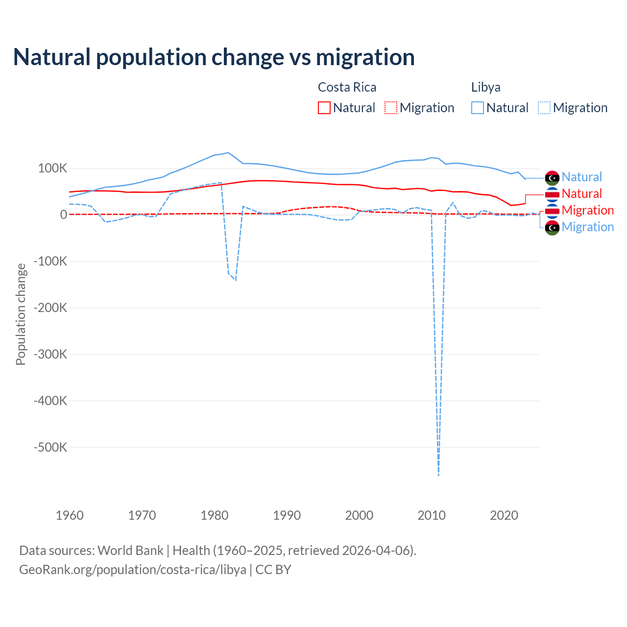 Over the last 10 years, 96.3% of the population change in Costa Rica is from natural causes (a gain of 362,624 people) and 3.69% is from migration (a gain of 13,900 people). In Libya 99.4% is from natural causes (a gain of 975,799 people) and 0.63% is from migration (a loss of 6,150 people).