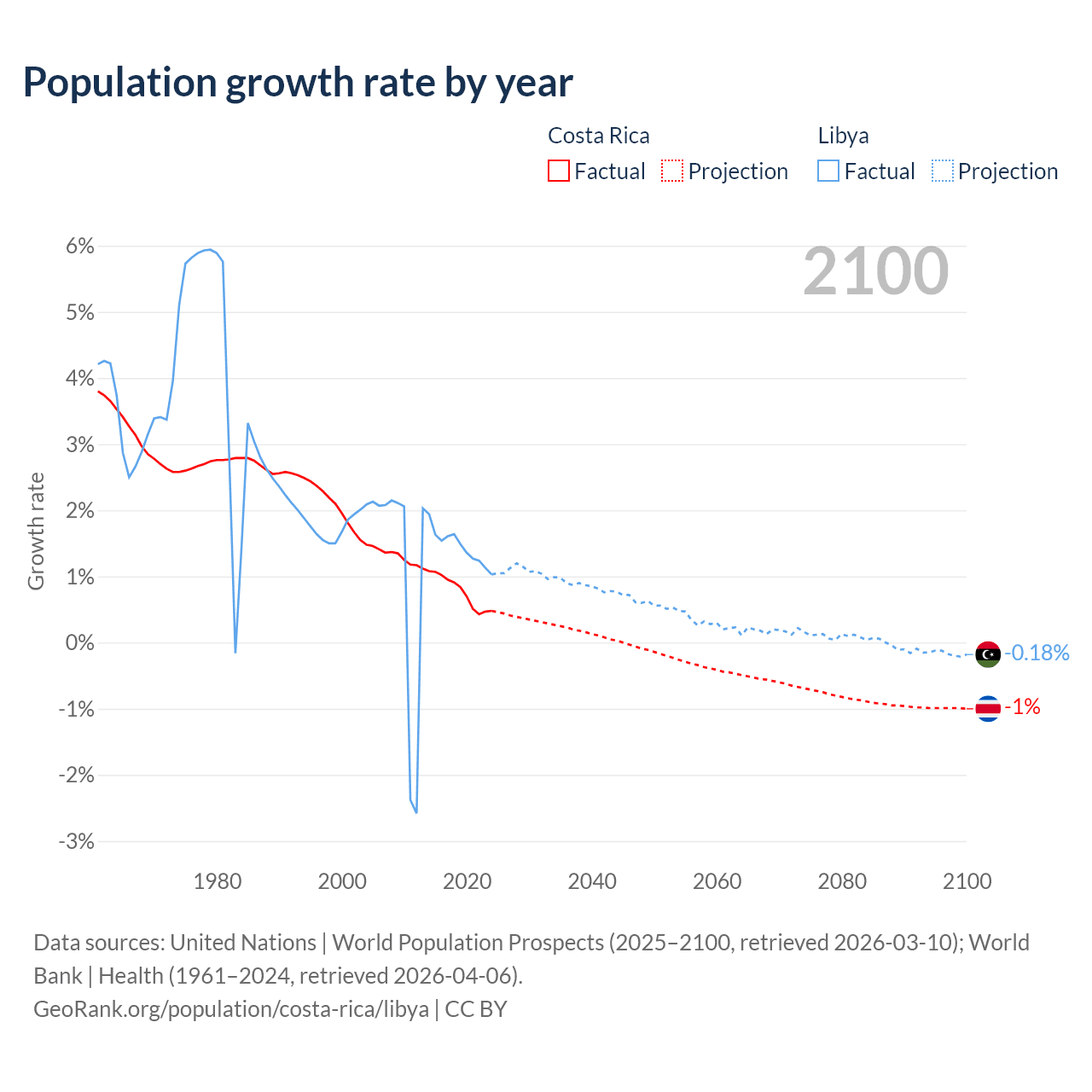- For the last 10 years, Costa Rica has had an average growth rate of +0.77% per year vs +1.44% in Libya.