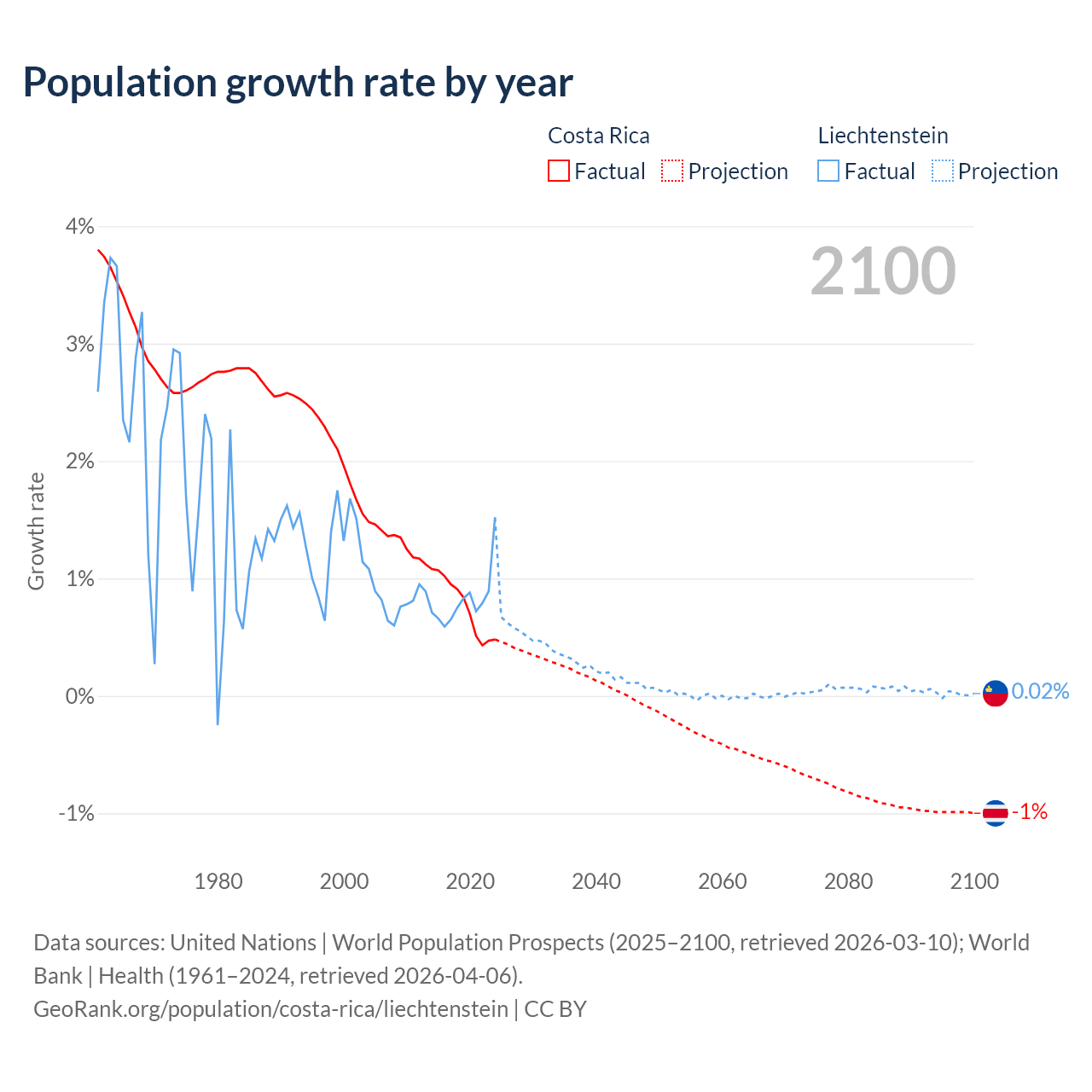 - For the last 10 years, Costa Rica has had an average growth rate of +0.77% per year vs +0.82% in Liechtenstein.